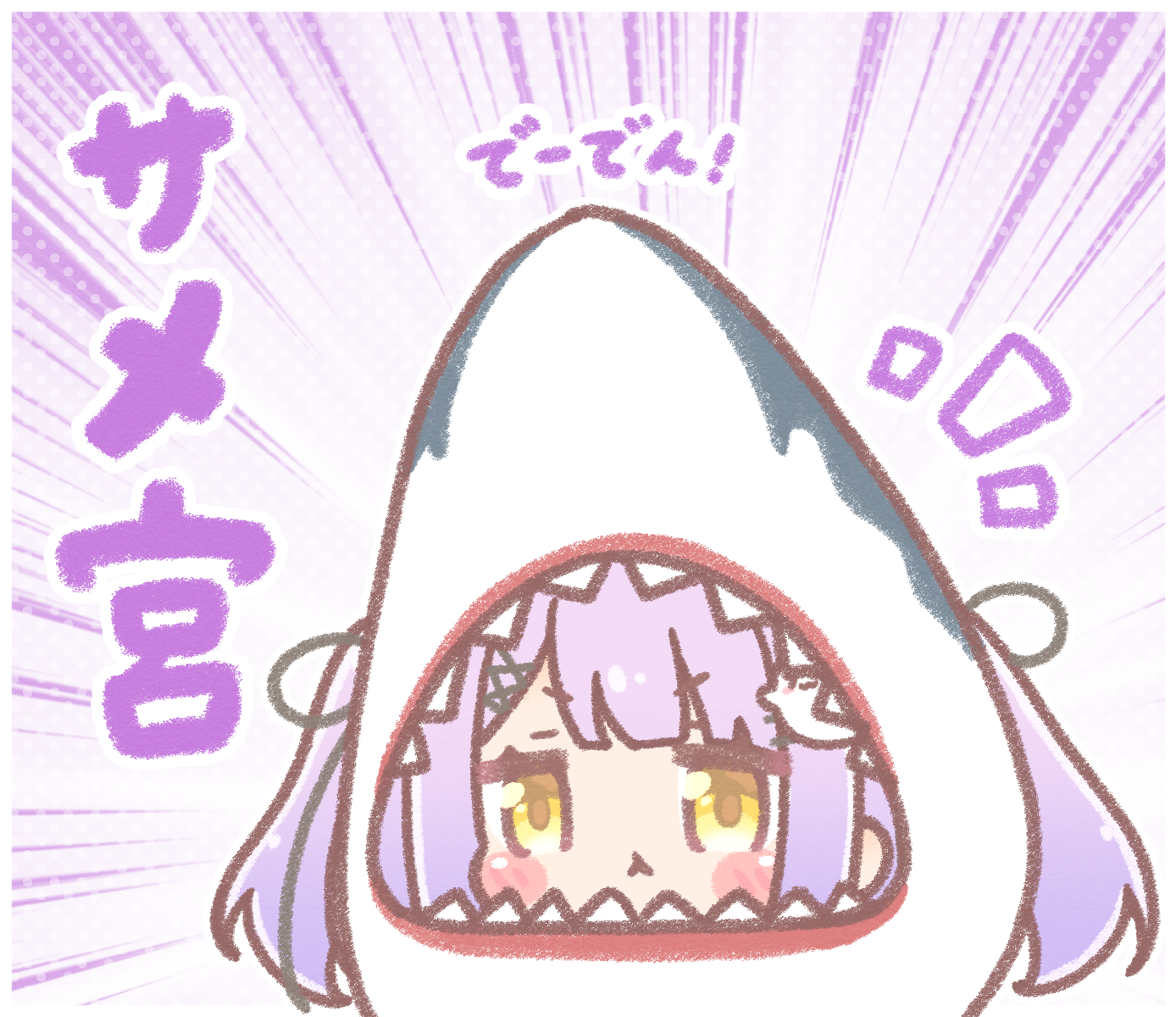 1girl :< animal_costume blush_stickers chibi closed_mouth commentary_request emphasis_lines ghost_hair_ornament hair_ornament hairclip highres mitarashi_neko notice_lines polka_dot polka_dot_background purple_hair shark_costume sharp_teeth shinomiya_runa solo teeth translation_request two_side_up virtual_youtuber vspo! x_hair_ornament yellow_eyes