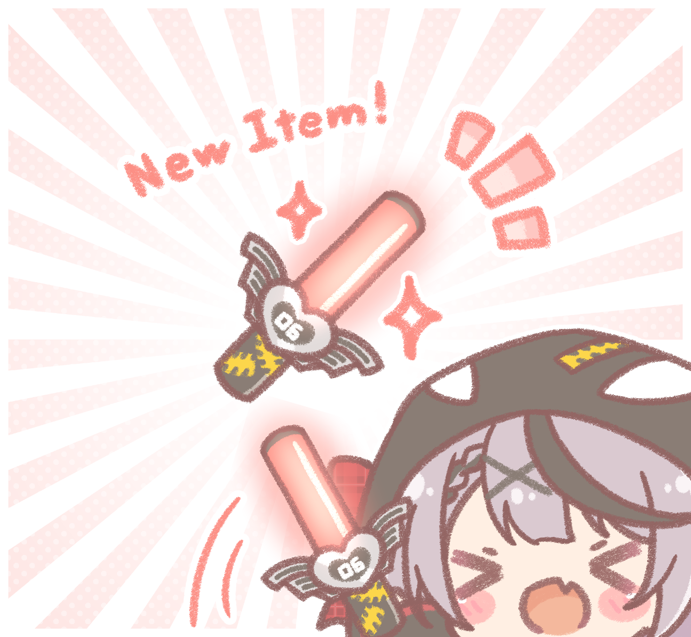 >_< 1girl :d black_hair blush_stickers bow braid chibi closed_eyes commentary_request fang glowstick grey_hair hair_ornament highres hololive hood hood_up mitarashi_neko motion_lines multicolored_hair notice_lines open_mouth plaid_bow polka_dot polka_dot_background red_bow sakamata_chloe sakamata_chloe_(1st_costume) smile solo speed_lines streaked_hair sunburst sunburst_background virtual_youtuber x_hair_ornament xd