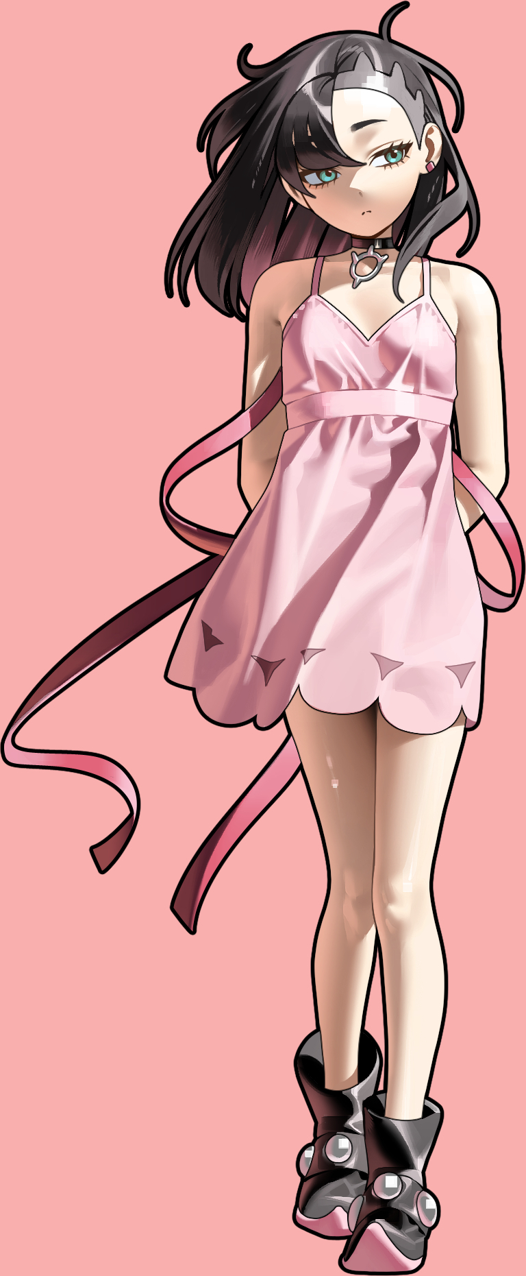 1girl 987645321o bare_shoulders black_boots black_choker black_hair boots breasts choker closed_mouth collarbone dress earrings full_body green_eyes highres jewelry long_hair looking_at_viewer marnie_(pokemon) nintendo no_jacket pink_background pink_dress pink_ribbon pokemon pokemon_sword_and_shield red_ribbon ribbon simple_background sleeveless sleeveless_dress small_breasts solo undercut