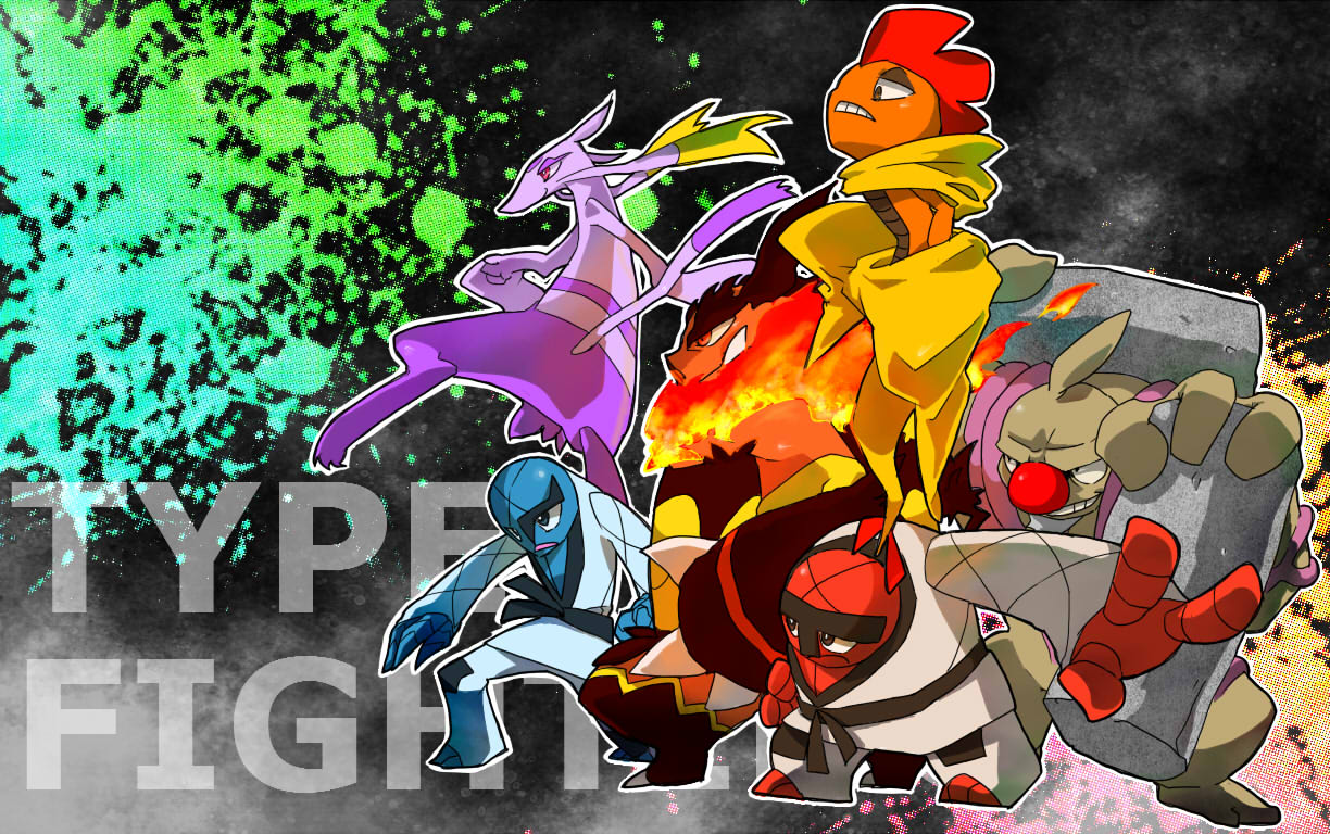 blue_skin closed_mouth colored_skin commentary_request conkeldurr dougi emboar fangs fighting_type_theme_(pokemon) fire gen_5_pokemon grin holding mienshao mkk0025 nintendo open_mouth outline pokemon pokemon_(creature) pokemon_focus red_etes red_nose red_skin sawk scrafty smile teeth throh white_outline