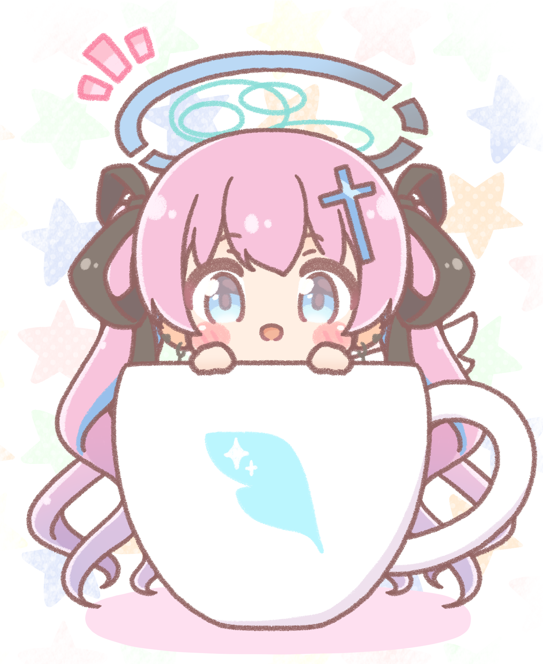 1girl :d amou_sera black_ribbon blue_eyes blue_hair blush_stickers chibi colored_shadow cup ear_piercing hair_ornament hair_ribbon halo highres in_container in_cup indie_virtual_youtuber long_hair mitarashi_neko multicolored_hair notice_lines open_mouth piercing pink_hair ribbon shadow smile solo star_(symbol) twintails two-tone_hair very_long_hair virtual_youtuber white_background white_wings wings