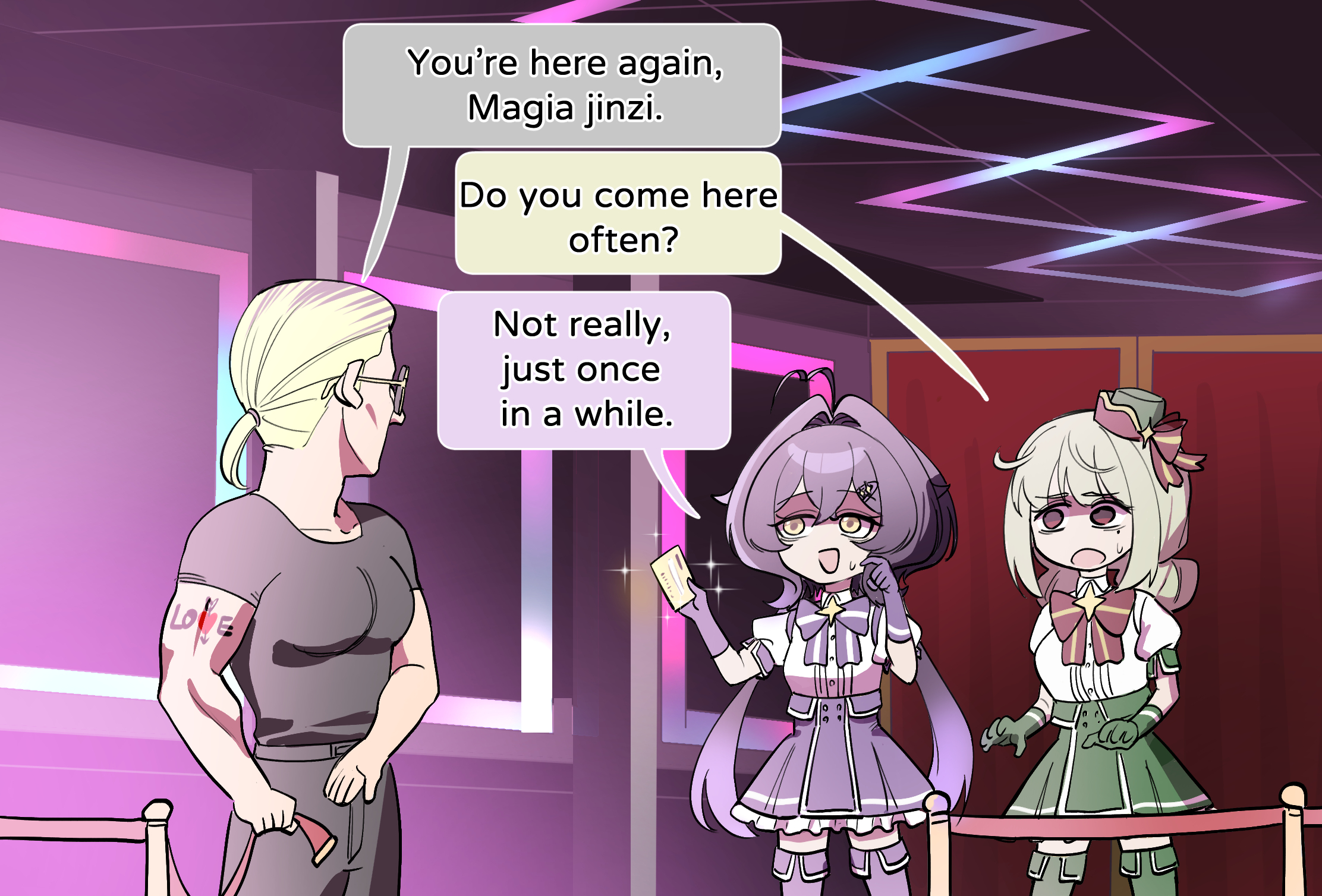 1boy 2girls ahoge araga_kiwi arm_tattoo artist_request black_pants black_shirt blonde_hair boots bow bowtie double_bun elbow_gloves gem gloves green_gloves green_skirt hair_bun hair_intakes hat heart heart_ahoge heart_tattoo high-waist_skirt highres hiiragi_utena long_hair low_twintails mahou_shoujo_ni_akogarete mini_hat mole mole_under_eye multiple_girls open_mouth pants purple_gloves purple_hair purple_skirt red_bow red_bowtie red_eyes shirt skirt star-shaped_gem sunglasses sweatdrop tattoo thigh_boots twintails very_long_hair white_shirt yellow_eyes yellow_gem