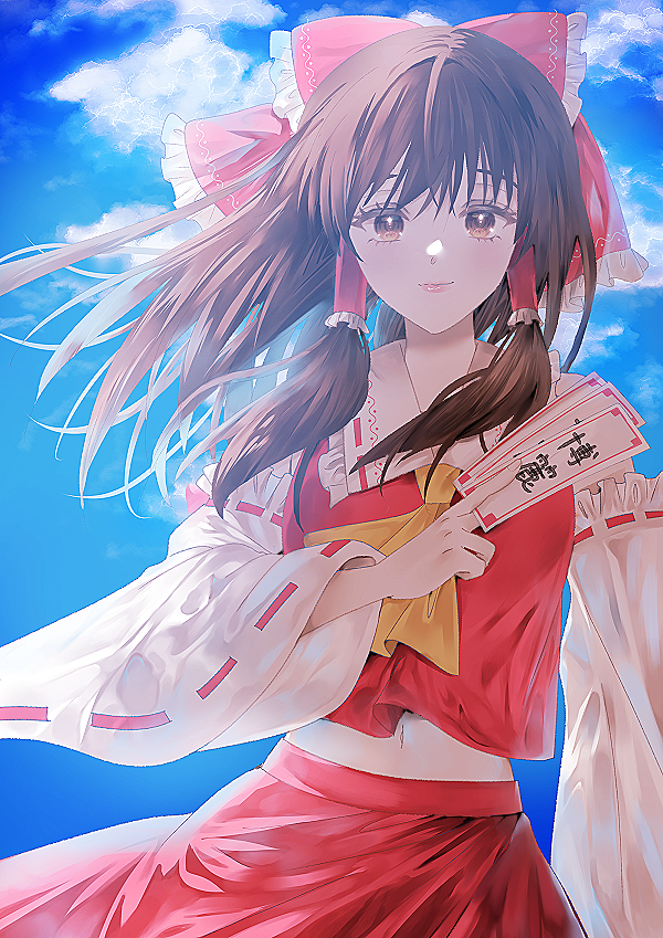 1girl ascot between_fingers blue_sky bow brown_eyes brown_hair closed_mouth cloud commentary day detached_sleeves eroriru frilled_bow frilled_hair_tubes frills hair_bow hair_tubes hakurei_reimu holding holding_ofuda long_hair looking_at_viewer midriff navel ofuda ofuda_between_fingers red_bow red_skirt ribbon-trimmed_sleeves ribbon_trim skirt skirt_set sky smile solo touhou untranslatable_commentary yellow_ascot