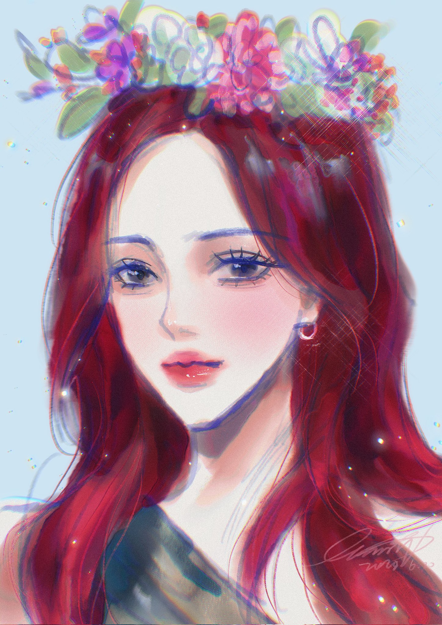 1girl black_eyes black_shirt blue_background blush commentary earrings english_commentary forehead highres isin_yang itzy jewelry k-pop looking_ahead off_shoudler portrait real_life red_hair red_lips ryujin_(itzy) shirt signature sketch solo