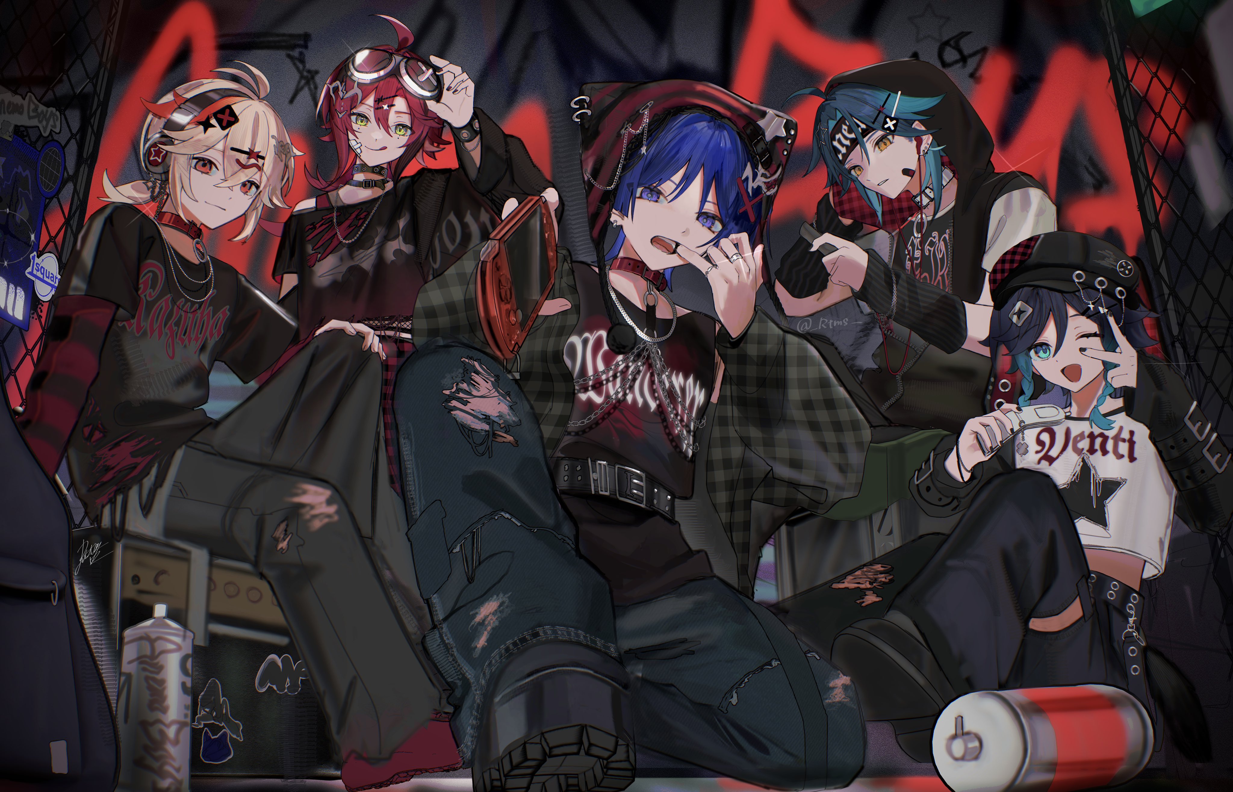 5boys absurdres adjusting_eyewear ahoge alternate_costume antenna_hair arm_warmers bandaid bandaid_on_face beanie belt_collar black_arm_warmers black_choker black_hat black_jacket black_pants blue_eyes blue_hair can chain-link_fence choker closed_mouth collar commentary crop_top earflap_beanie earphones english_commentary eyewear_on_head fence finger_in_own_mouth genshin_impact goggles goggles_on_head gradient_hair green_eyes green_hair grey_pants hair_ornament handheld_game_console hat headband headphones highres holding holding_handheld_game_console hood hood_up jacket jewelry kaedehara_kazuha long_sleeves looking_at_viewer male_focus mole mole_under_eye multicolored_hair multiple_boys multiple_rings necklace one_eye_closed open_clothes open_jacket open_mouth pants plaid_clothes plaid_jacket ponytail print_shirt red_choker red_eyes red_hair ring rtms scaramouche_(genshin_impact) shikanoin_heizou shirt short_hair short_ponytail short_sleeves sitting smile striped_clothes striped_hat striped_shirt torn_clothes torn_pants v venti_(genshin_impact) x_hair_ornament xiao_(genshin_impact) yellow_eyes