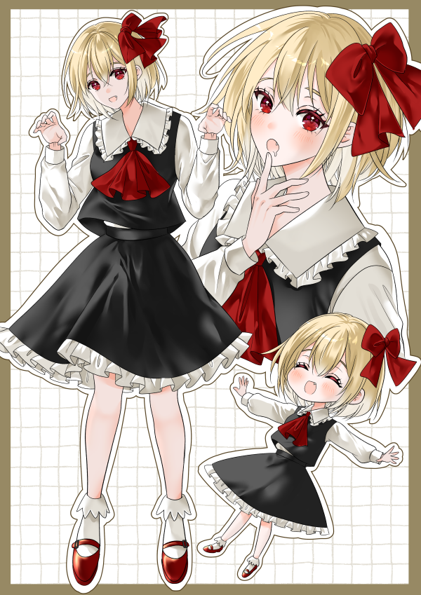 1girl ascot black_skirt black_vest blonde_hair blush border bow claw_pose closed_eyes collared_shirt commentary deformed eroriru facing_viewer frilled_shirt_collar frilled_skirt frills full_body grid_background hair_bow long_sleeves looking_at_viewer mary_janes medium_hair multiple_views open_mouth outside_border outstretched_arms red_ascot red_bow red_eyes red_shoes rumia shirt shoes skirt skirt_set smile socks spread_arms touhou vest white_shirt white_socks