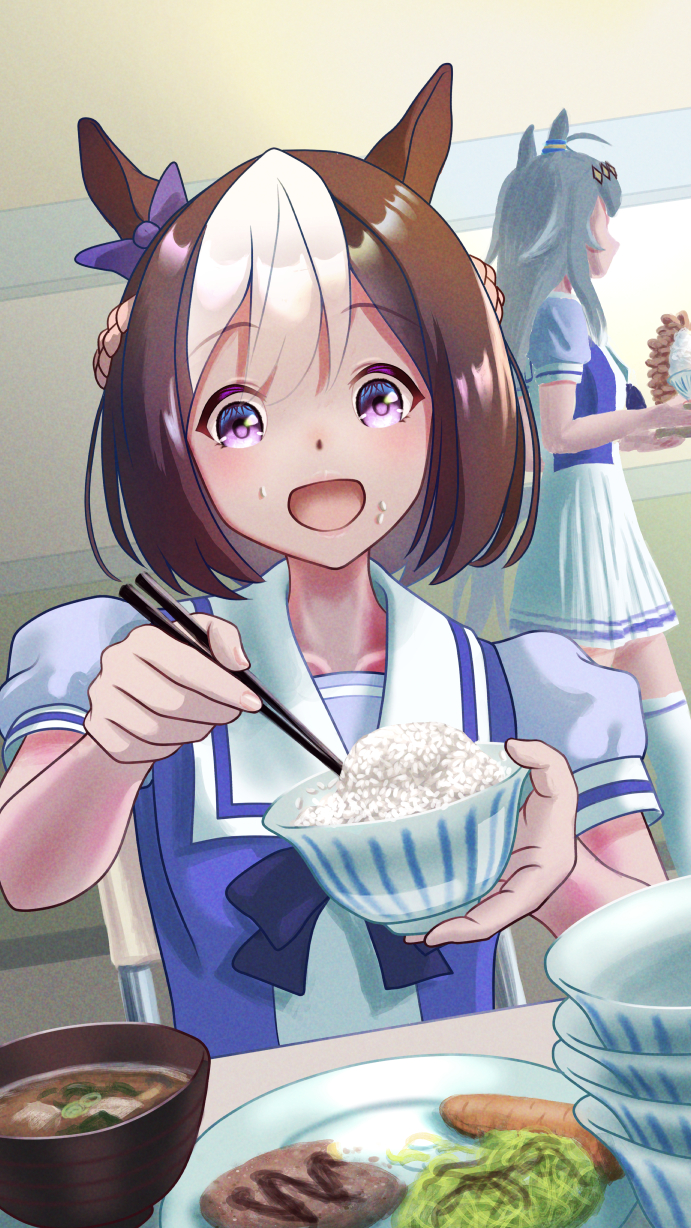 2girls ahoge animal_ears blush bow bowl bowl_stack bowtie braid brown_hair carrot chopsticks commentary_request ear_bow ear_ornament ear_ribbon eating food food_on_face glutton grey_hair grey_tail hair_between_eyes hair_ornament hairband half_up_braid highres holding holding_bowl holding_chopsticks horse_ears horse_girl horse_tail long_hair multicolored_hair multiple_girls oguri_cap_(umamusume) open_mouth puffy_short_sleeves puffy_sleeves purple_bow purple_bowtie purple_eyes purple_shirt rice_bowl sailor_collar sailor_shirt sale_taishougai school_uniform shirt short_hair short_sleeves skirt smile special_week_(umamusume) tail thighhighs tracen_school_uniform two-tone_hair umamusume white_hair white_sailor_collar white_skirt white_thighhighs