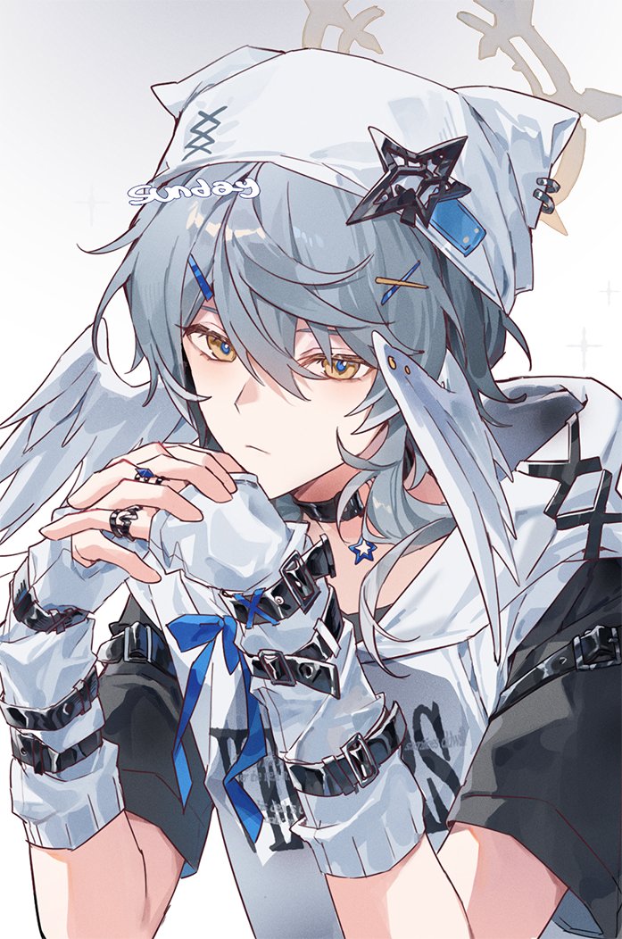 1boy alternate_costume beanie belt blue_hair blue_pupils choker clothes_writing commentary feathers fingerless_gloves gloves hair_between_eyes hair_ornament hairclip halo halo_behind_head hat head_wings honkai:_star_rail honkai_(series) hood hood_down jewelry male_focus own_hands_together piercing ring sha_(nz2) shirt short_sleeves sidelocks sunday_(honkai:_star_rail) untranslatable_commentary upper_body white_feathers wings x_hair_ornament yellow_eyes