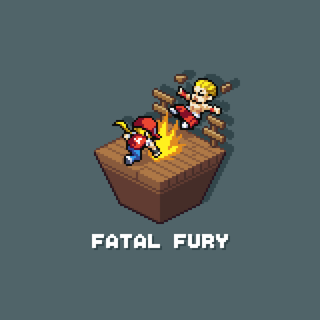 2boys attack blonde_hair blue_pants breaking broken_fence copyright_name denim fatal_fury fatal_fury_cap fence fingerless_gloves gebo_usagi geese_howard gloves green_background hakama hat jacket japanese_clothes jeans long_hair male_focus multiple_boys pants pixel_art ponytail power_geyser red_hakama red_hat red_jacket short_hair simple_background terry_bogard topless_male wooden_fence wooden_floor
