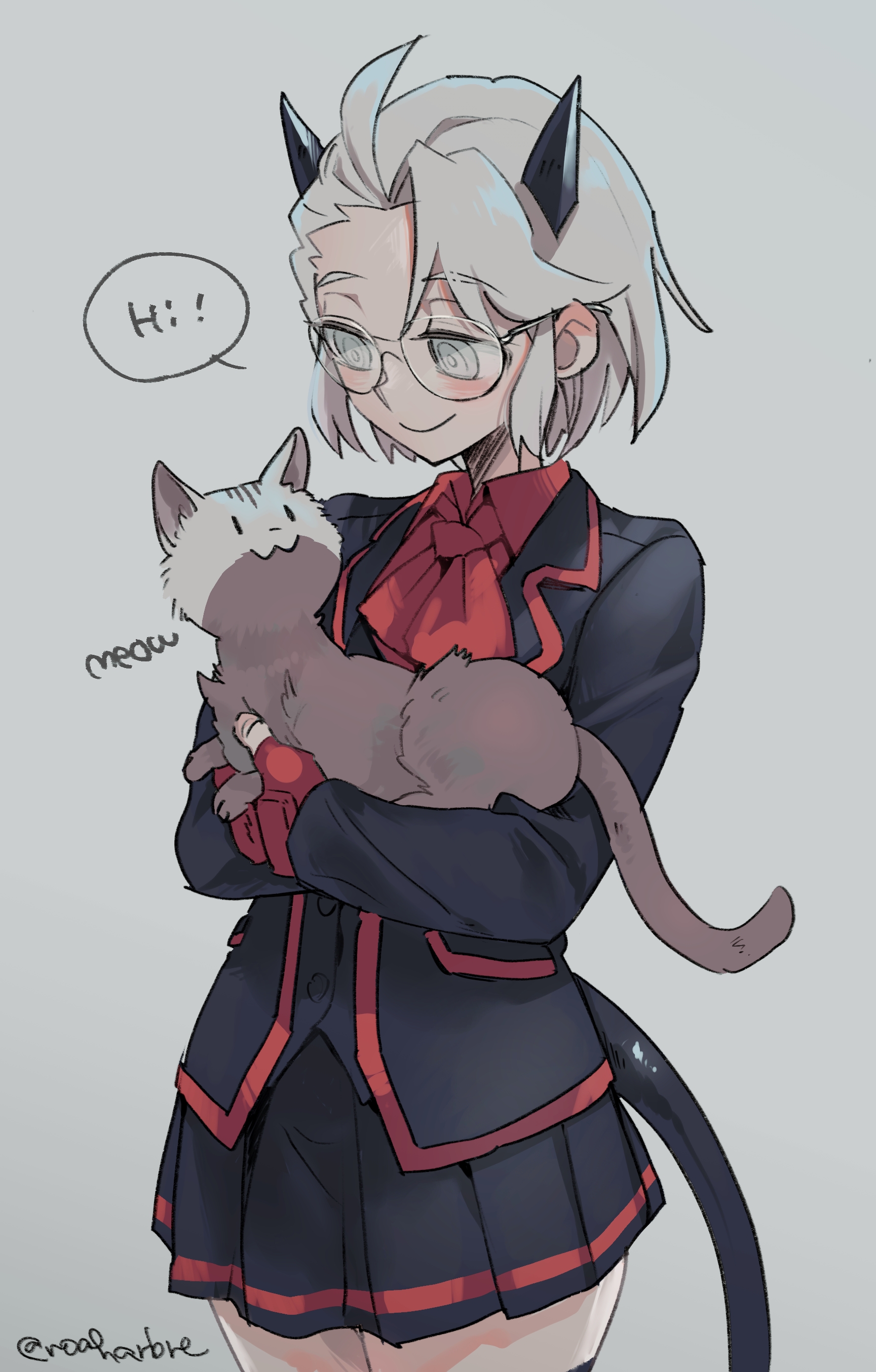 1girl absurdres alternate_costume animal artist_name ascot black_horns black_jacket black_skirt black_tail blind cat commentary demon_girl demon_horns demon_tail english_text glasses gloves grey_eyes grey_hair helltaker highres holding holding_animal horns jacket justice_(helltaker) lmcat09_(helltaker) long_sleeves looking_at_animal miniskirt mixed-language_commentary noah_(tettsui-sole) pleated_skirt red_ascot red_gloves red_shirt round_eyewear shirt short_hair skirt smile speech_bubble tail thighhighs twitter_username zettai_ryouiki