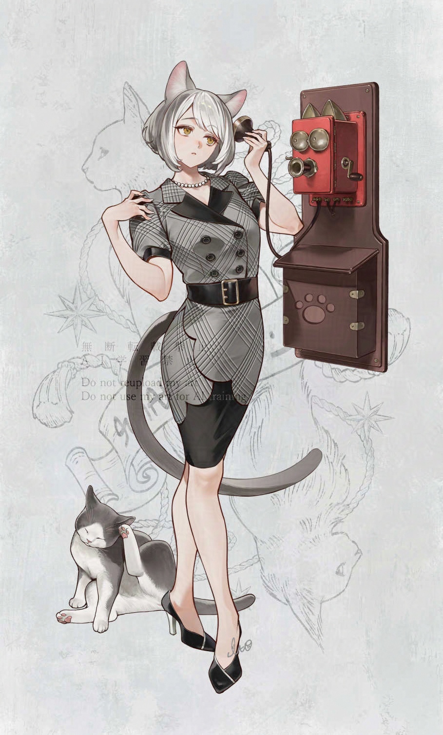 1girl animal_ears animalization antique_phone belt black_belt black_shoes black_skirt black_trim bob_cut brown_eyes cat cat_ears cat_girl cat_tail commentary crank dress earpiece english_commentary grey_background grey_dress grey_hair hand_on_own_shoulder hatching_(texture) high_heels highres itou_(very_ito) jewelry multicolored_hair necklace original parted_lips paw_print pearl_necklace pencil_skirt person_and_animalization puffy_short_sleeves puffy_sleeves ringer_box shoes short_hair short_sleeves skirt swept_bangs tail talking_on_phone two-tone_hair watermark white_hair