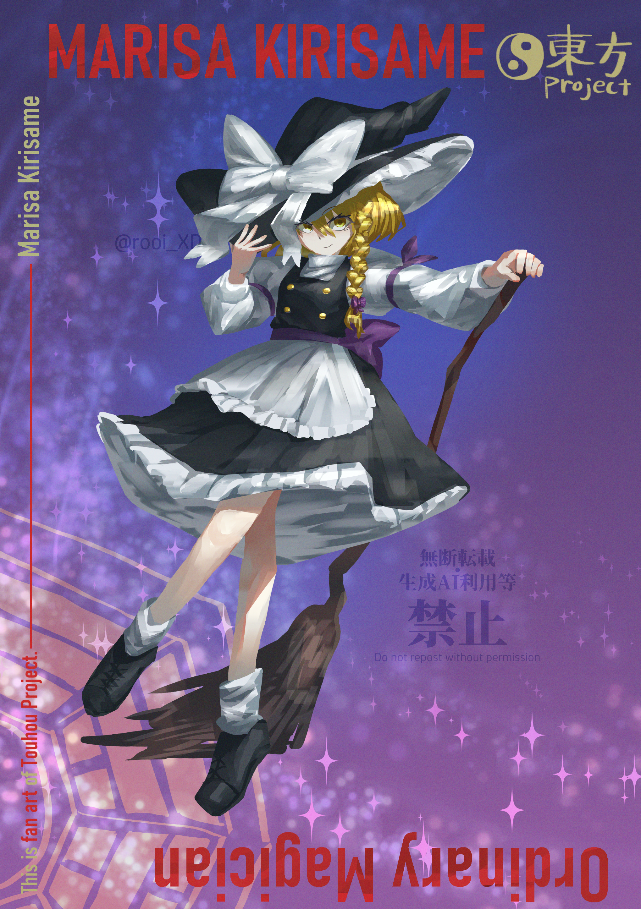 1girl absurdres apron back_bow black_hat black_shoes black_skirt black_vest blonde_hair bow braid broom character_name closed_mouth commentary_request copyright_name frilled_skirt frills full_body hair_bow hand_on_headwear hat hat_bow highres kirisame_marisa long_hair looking_at_viewer purple_bow revision rooi_xd shoes side_braid single_braid skirt smile socks solo touhou twitter_username vest waist_apron watermark white_apron white_bow white_socks witch_hat yellow_eyes