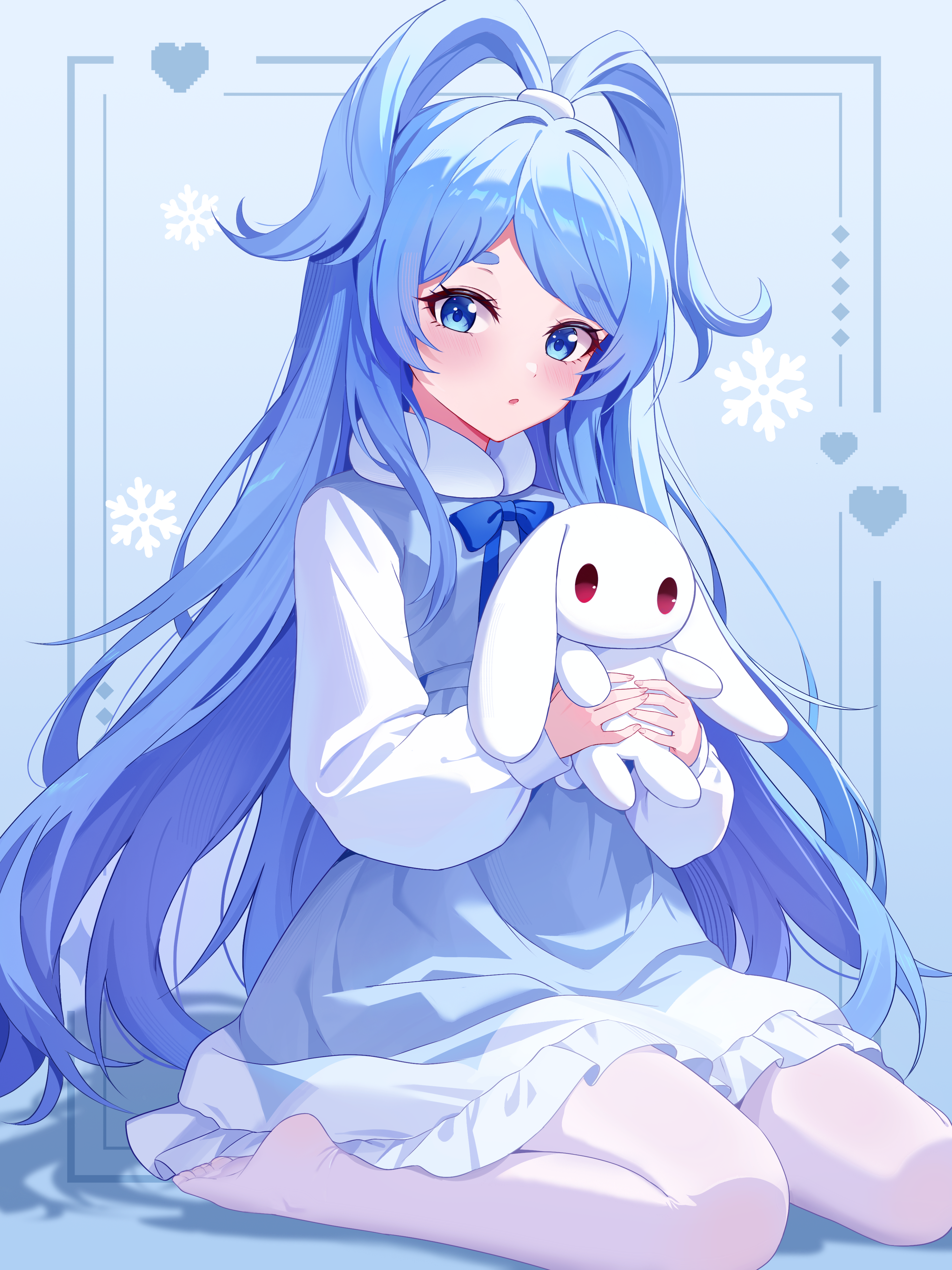 1girl absurdres black_hair blue_bow blue_dress blue_eyes blue_hair blush bow bowtie daer_maodou_(roco_kingdom:_world) dress frilled_dress frills full_body heart highres holding holding_stuffed_toy long_hair long_sleeves looking_at_viewer no_shoes pantyhose parted_lips puffy_long_sleeves puffy_sleeves roco_kingdom roco_kingdom:_world shirt short_eyebrows sitting sleeveless sleeveless_dress snowflakes socks solo stuffed_animal stuffed_rabbit stuffed_toy thick_eyebrows very_long_hair wariza white_dress white_pantyhose white_shirt white_socks xiongji_z_z xueying_wawa_(anthropomorphism)_(roco_kingdom:_world)