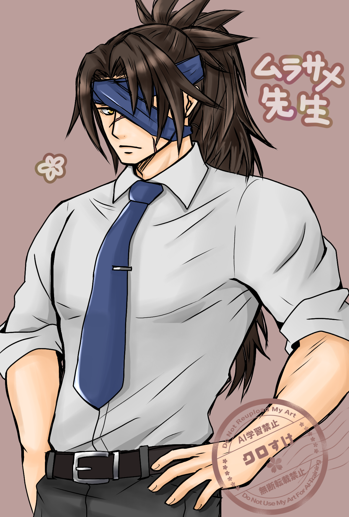1boy alternate_costume belt blue_necktie blue_pants contemporary eyepatch hand_on_own_hip headband highres murasame_(rune_factory) necktie pants rune_factory rune_factory:_guardians_of_azuma shiawaselapin shirt sleeves_rolled_up translation_request white_shirt
