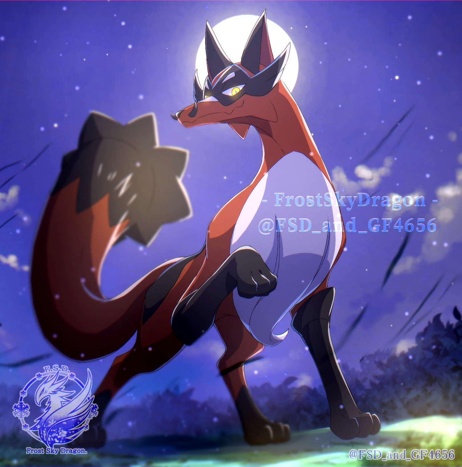 animal_focus cloud commentary_request fox full_body full_moon gen_8_pokemon glowing glowing_eyes gurifon highres moon night nintendo no_humans outdoors pokemon pokemon_(creature) pokemon_focus sky smile solo standing_on_three_legs star_(sky) thievul watermark yellow_eyes
