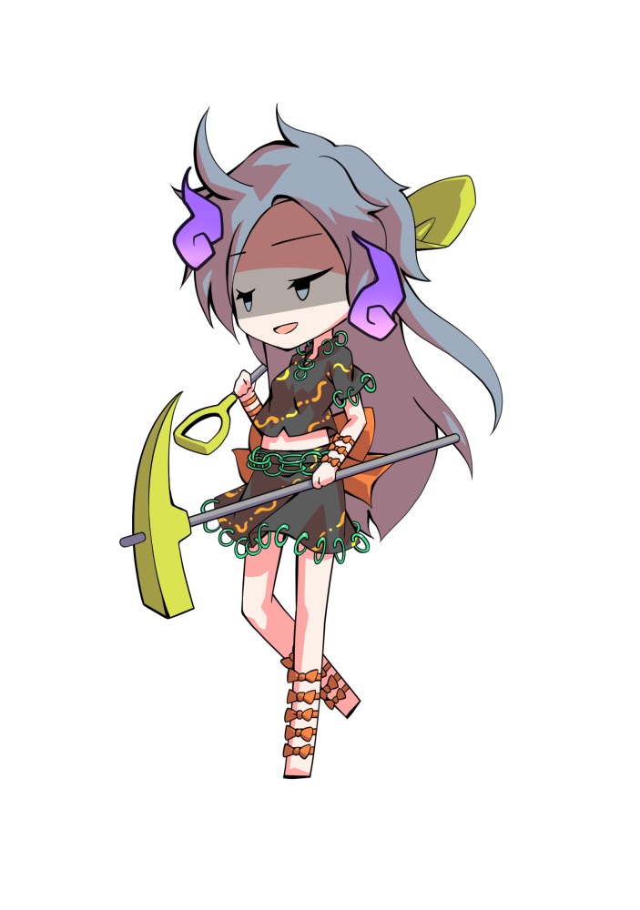 1girl back_ribbon barefoot black_shirt chibi chibi_only commentary_request dairi full_body grey_eyes grey_hair half-closed_eyes hand_up himemushi_momoyo holding holding_pickaxe holding_shovel large_variant_set long_hair midriff orange_ribbon pickaxe ribbon shaded_face shirt short_sleeves shovel simple_background skirt skirt_set solo standing standing_on_one_leg tachi-e touhou transparent_background variant_set