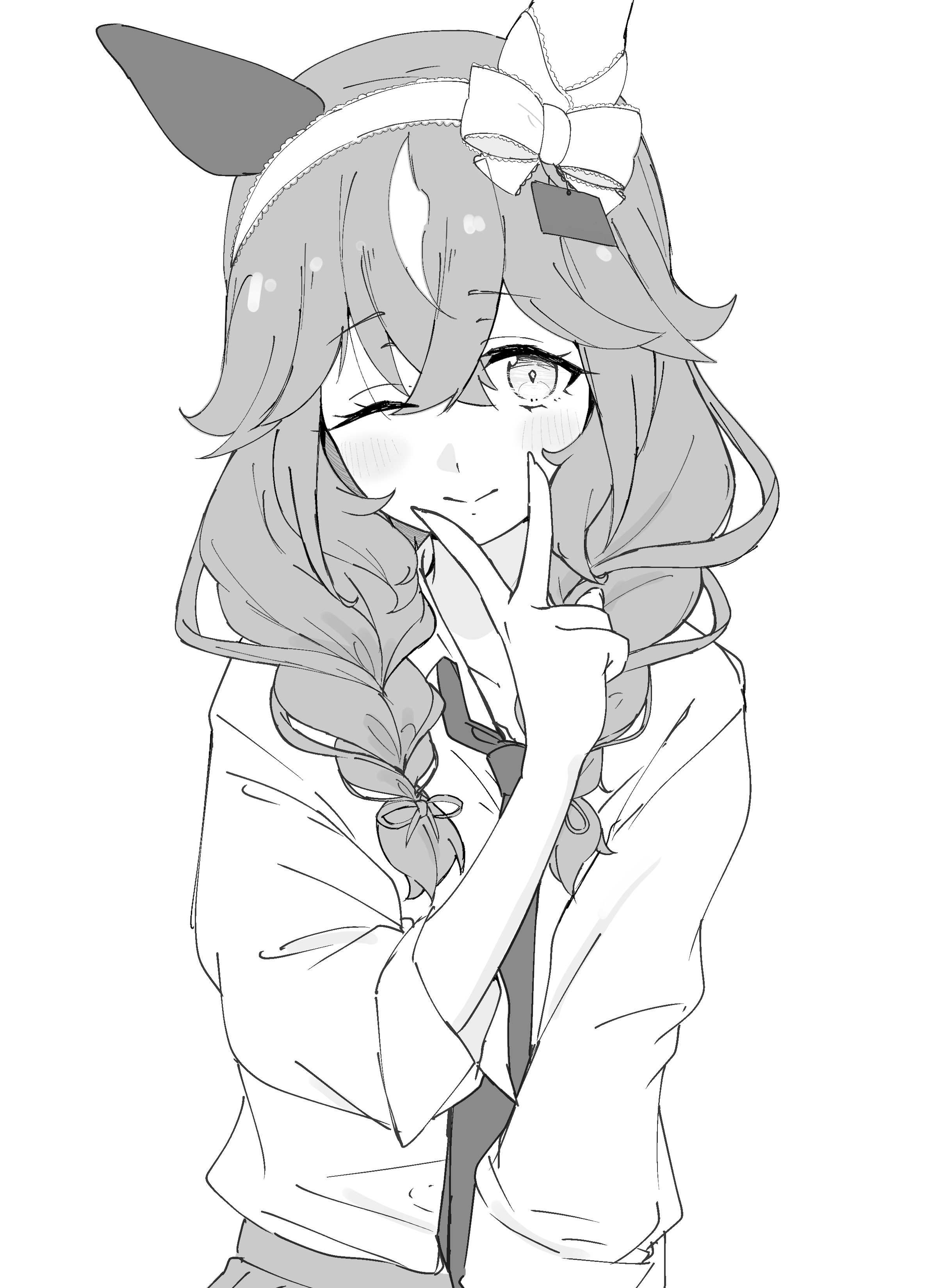 1girl absurdres animal_ears braid breasts collarbone curren_bouquetd'or_(umamusume) hair_between_eyes hair_ornament hairband highres horse_ears horse_girl horse_tail long_hair looking_at_viewer low_twin_braids monochrome necktie smile solo tail takapachi.jp twin_braids umamusume v white_background