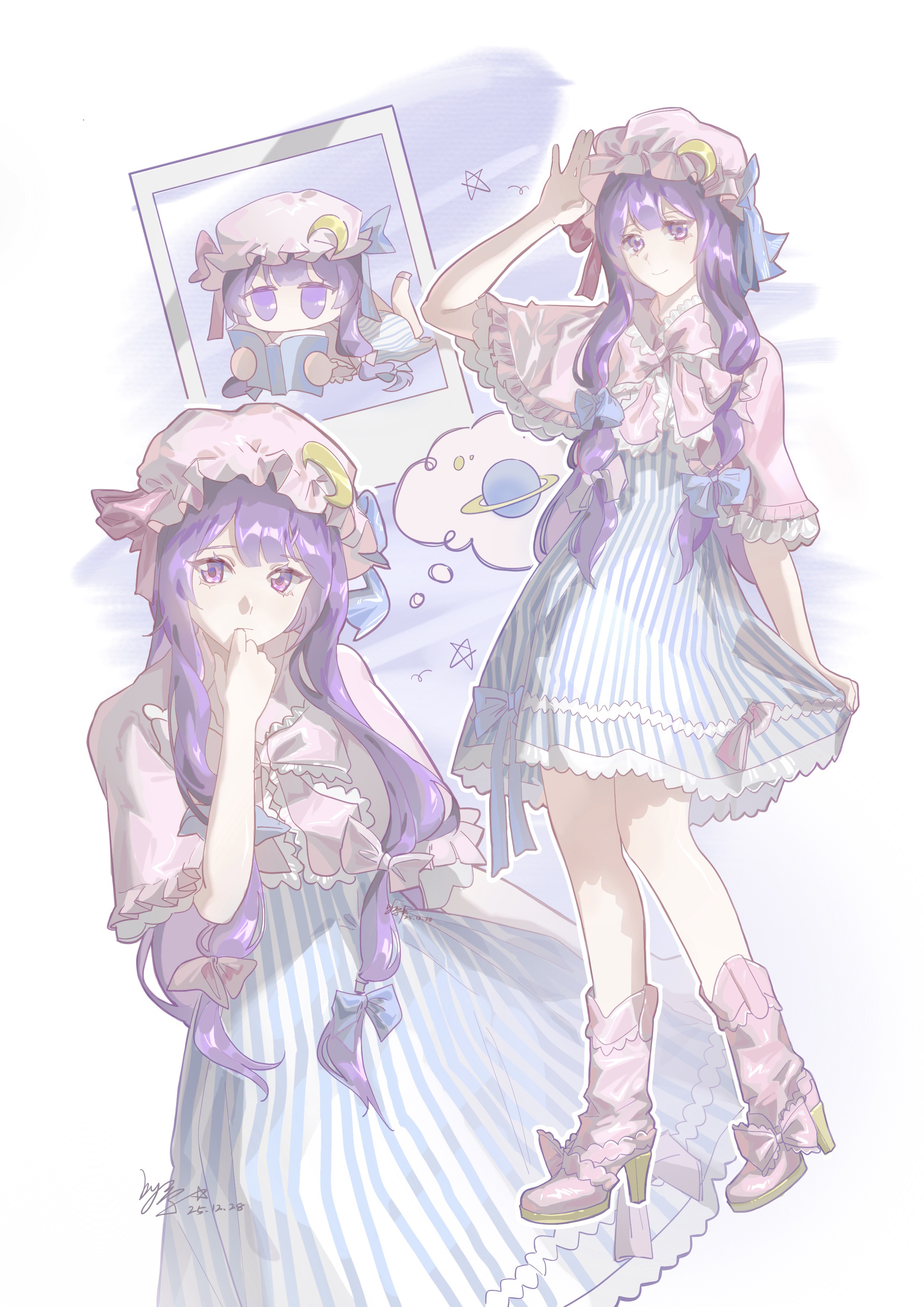 1girl absurdres alternate_costume blue_bow blue_dress boots bow bowtie capelet chinese_commentary closed_mouth commentary_request crescent crescent_hat_ornament dated dress hair_bow hat hat_ornament high_heel_boots high_heels highres mob_cap multiple_hair_bows multiple_views patchouli_knowledge photo_(object) pink_boots pink_bow pink_bowtie pink_capelet pink_hat purple_eyes purple_hair signature smile speech_bubble striped_clothes striped_dress thought_bubble touhou vertical-striped_clothes vertical-striped_dress xinbuqing