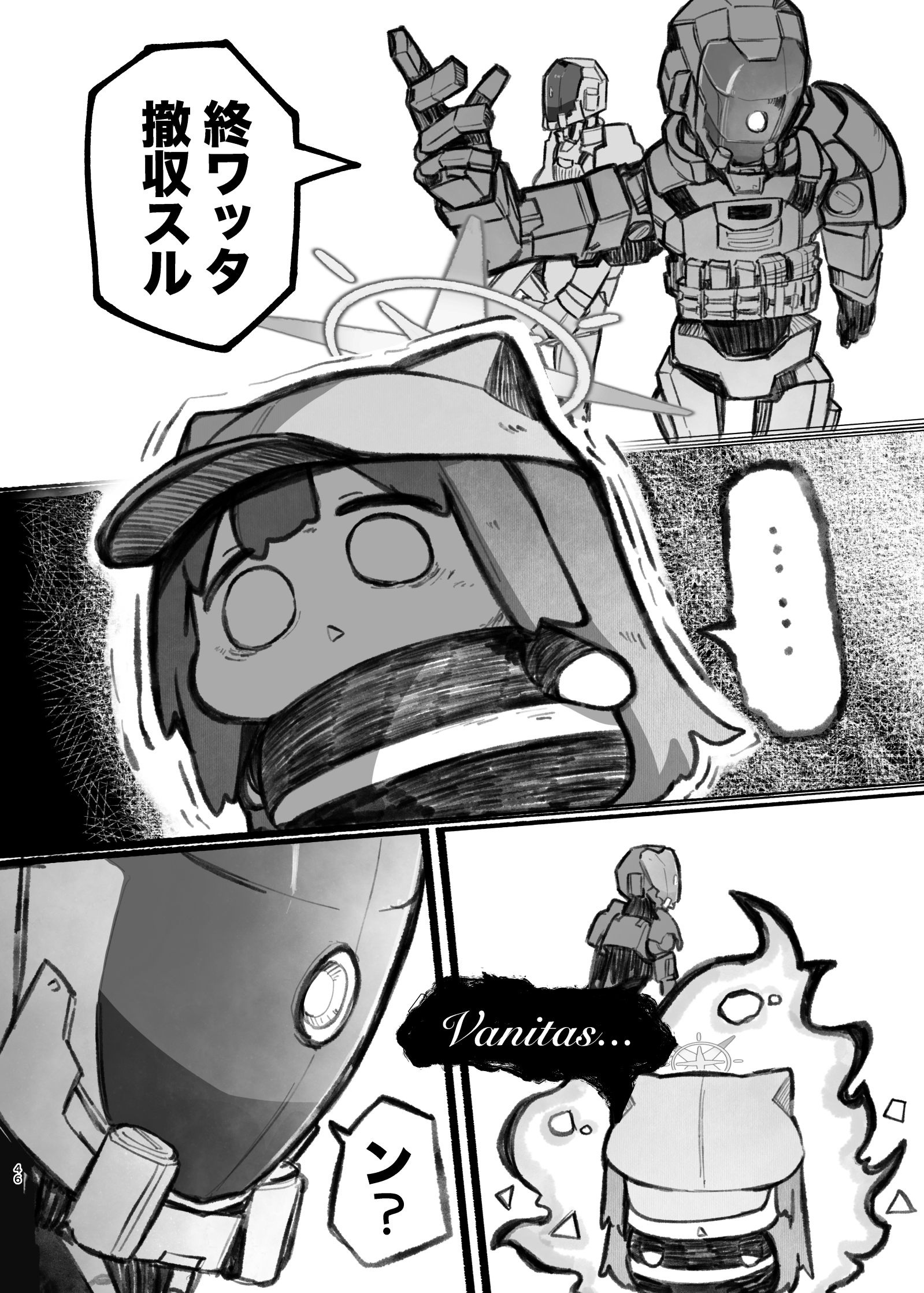 1girl animal_ears blue_archive cat_ears chibi commentary_request greyscale halo highres latin_text midriff monochrome robot saori_(blue_archive) shaded_face speech_bubble translation_request urode