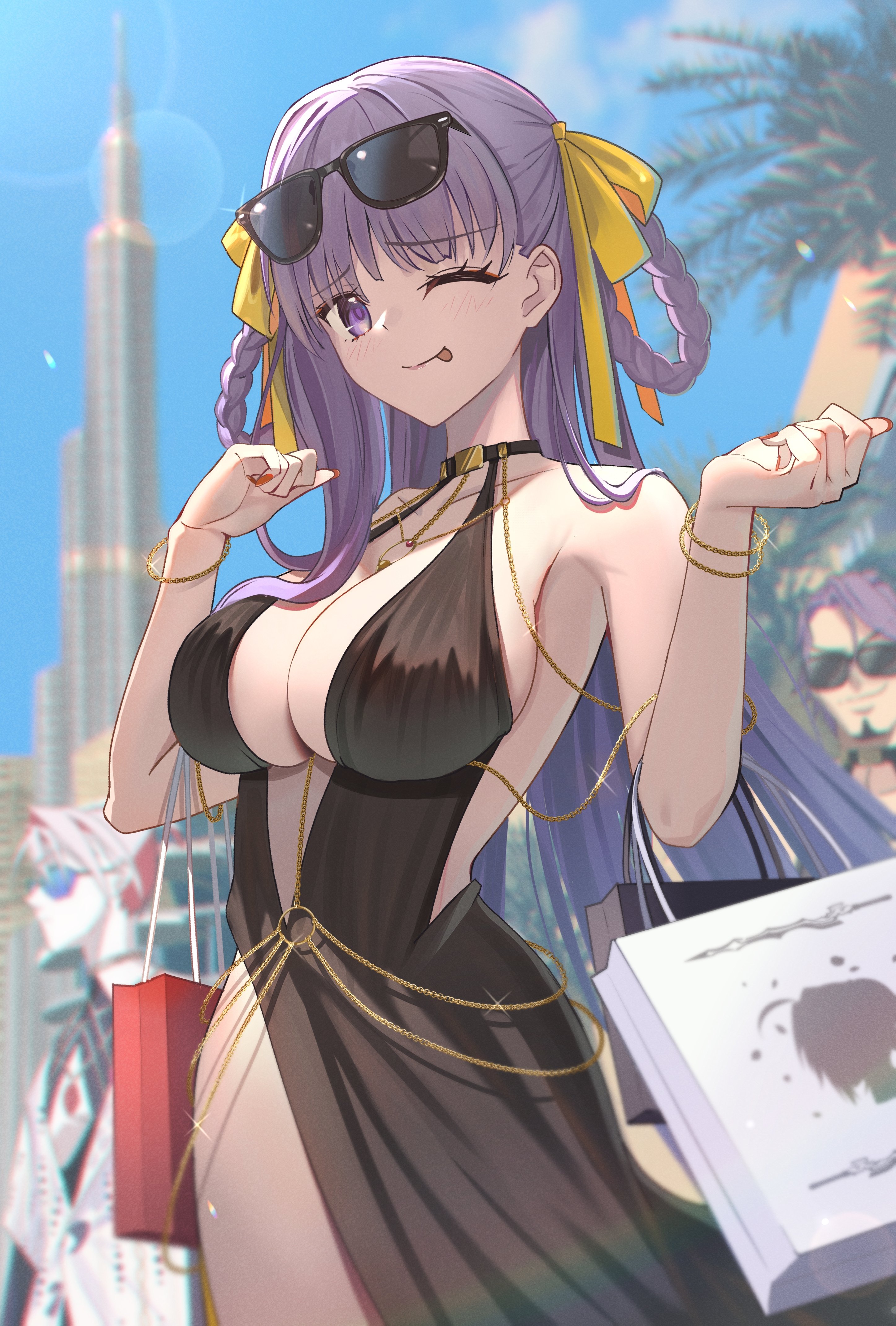 1girl 2boys absurdres bag bare_shoulders bb_(fate) bb_dubai_(fate) black_dress braid braided_hair_rings breasts burj_khalifa center_opening chain cleavage dress duryodhana_(fate) fate/grand_order fate_(series) gold_chain hair_ribbon hair_rings highres jewelry karna_(fate) karna_(summer_outfit)_(fate) large_breasts long_hair looking_at_viewer mishiro_(ixtlolton) multiple_boys necklace one_eye_closed purple_eyes purple_hair ribbon shopping_bag smile solo_focus tongue tongue_out variant_set very_long_hair yellow_ribbon