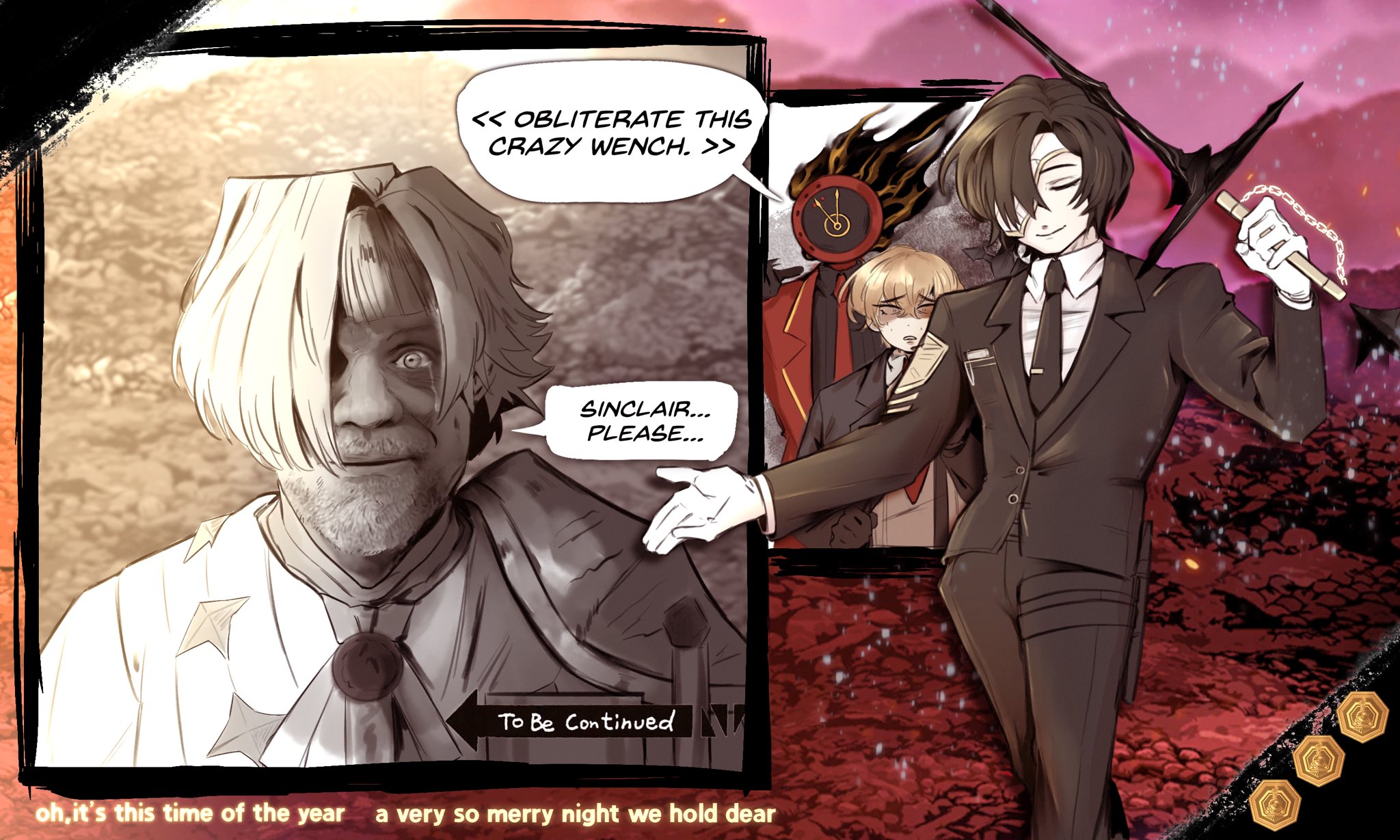 1girl 1other 2boys between_two_worlds black_coat black_gloves black_hair black_necktie black_shirt black_suit blonde_hair clock closed_eyes coat dante_(limbus_company) english_text fire formal_clothes gameplay_mechanics gloves highres index_(identity)_(project_moon) joe_rogan kromer_(project_moon) limbus_company mask mcnauru meme mili_(band) multiple_boys necktie object_head project_moon red_coat red_necktie shirt short_hair sinclair_(project_moon) speech_bubble suit sword tearing_up to_be_continued weapon white_gloves white_shirt yellow_eyes yi_sang_(project_moon)
