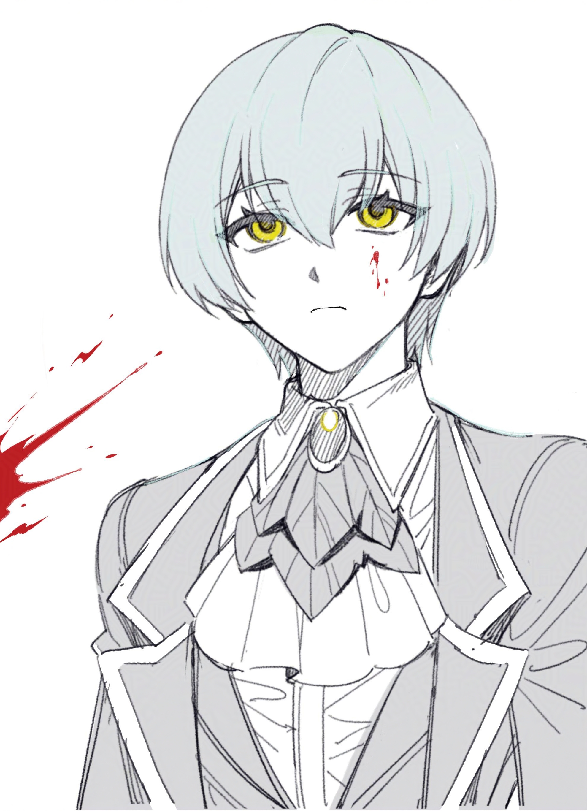 1girl absurdres angela_(project_moon) ascot blood blood_on_face brooch closed_mouth coat collared_shirt expressionless greyscale highres jewelry lapels library_of_ruina monochrome notched_lapels project_moon shirt shiwu15 simple_background solo speech_bubble spot_color upper_body yellow_eyes