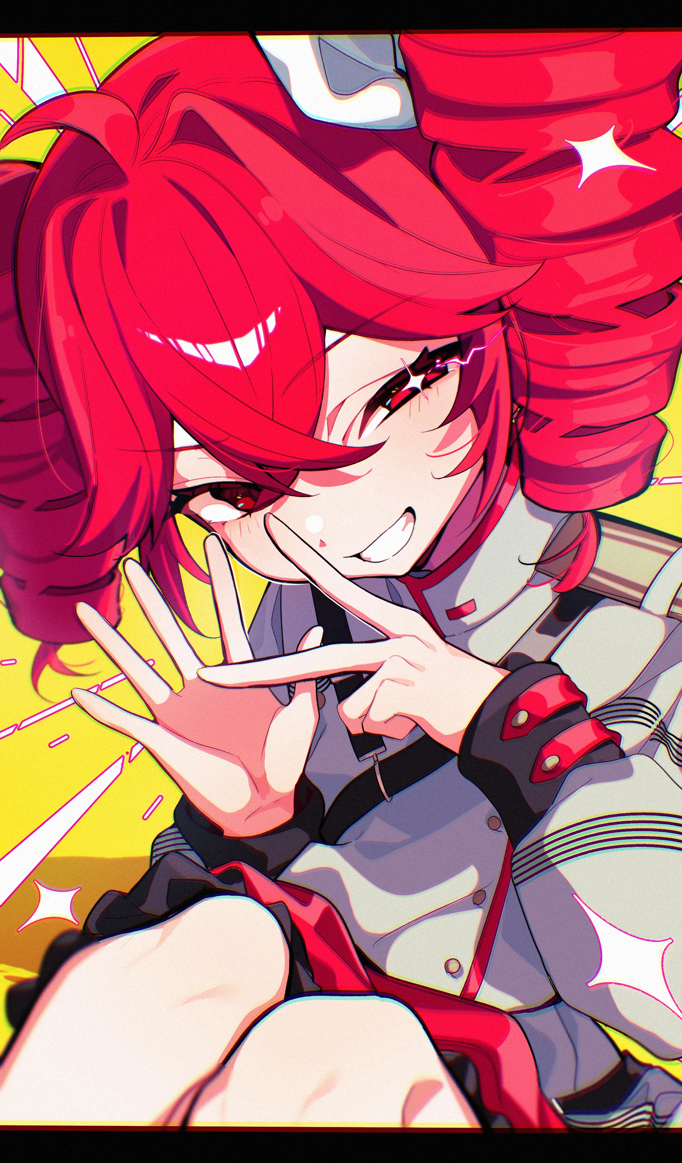 1girl absurdres ahoge commentary crossed_bangs drill_hair frilled_skirt frills grey_jacket hair_between_eyes hair_ribbon highres jacket kasane_teto kasane_teto_(sv) looking_at_viewer red_eyes red_hair ribbon shigure_(rinky_creater) skirt smile smug solo synthesizer_v twin_drills untranslatable_commentary utau v white_ribbon yellow_background