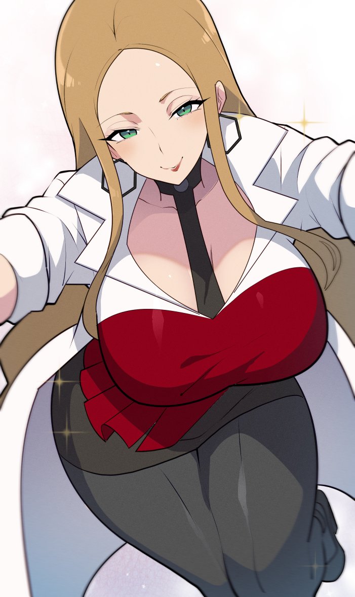 1girl black_necktie black_pantyhose blonde_hair breasts earrings green_eyes jacket jewelry large_breasts long_hair looking_at_viewer mituyota_76 multicolored_jacket necktie nintendo oleana_(pokemon) pantyhose pokemon pokemon_sword_and_shield red_jacket smile solo standing standing_on_one_leg two-tone_jacket white_jacket