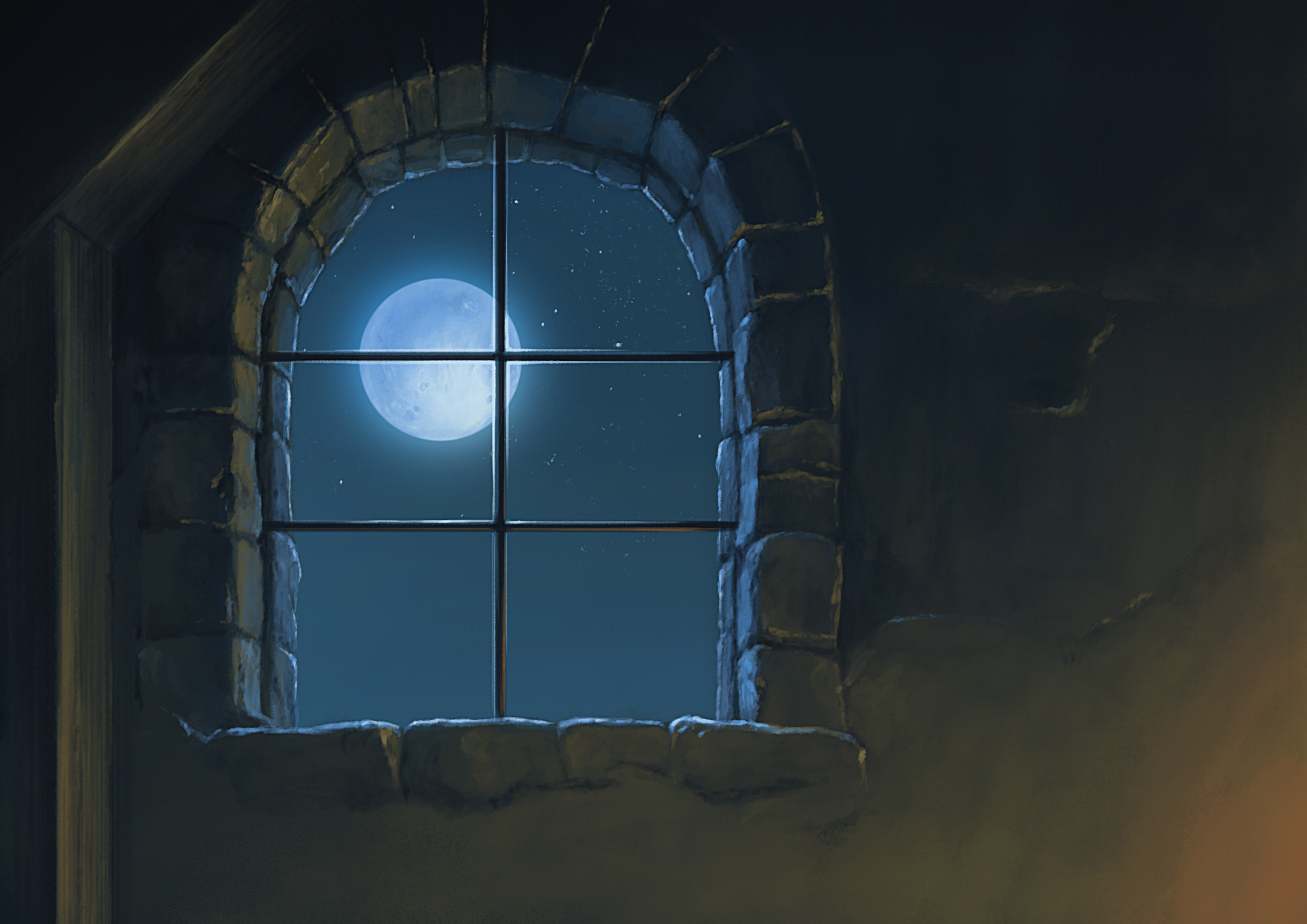 absurdres arched_window atelier_pocket full_moon highres indoors iron_bars moon night no_humans original painting_(medium) shadow sky star_(sky) starry_sky stone_wall sunlight traditional_media window