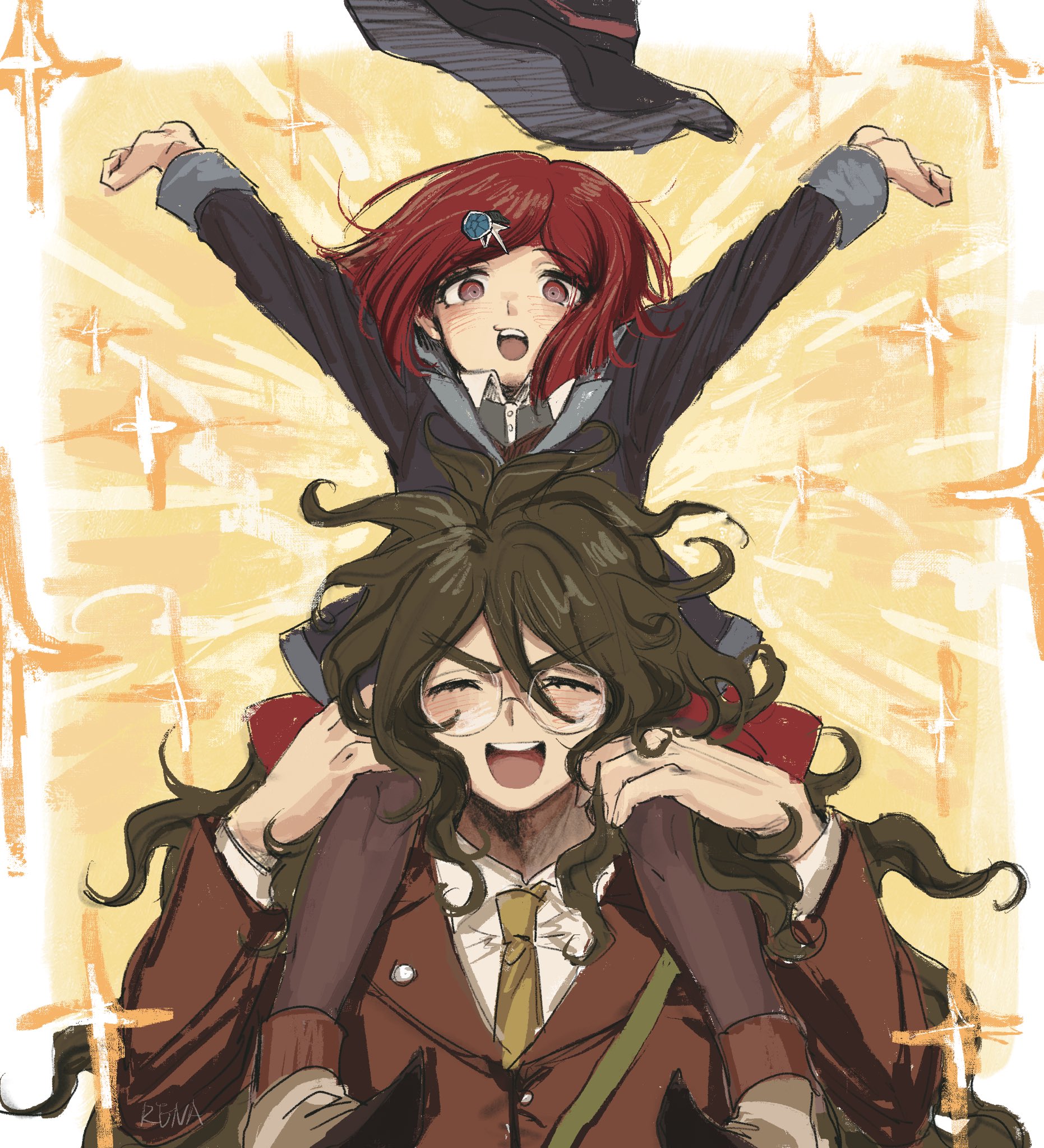 1boy 1girl :d :o arms_up black_hat black_jacket blindsong37 blush brown_hair brown_jacket brown_thighhighs collared_shirt danganronpa_(series) danganronpa_v3:_killing_harmony gem_hair_ornament glasses gokuhara_gonta green_necktie grey_shirt hat highres jacket long_hair long_sleeves necktie open_mouth red_hair round_eyewear shirt smile teeth thighhighs upper_teeth_only white_background white_shirt witch_hat yellow_background yumeno_himiko