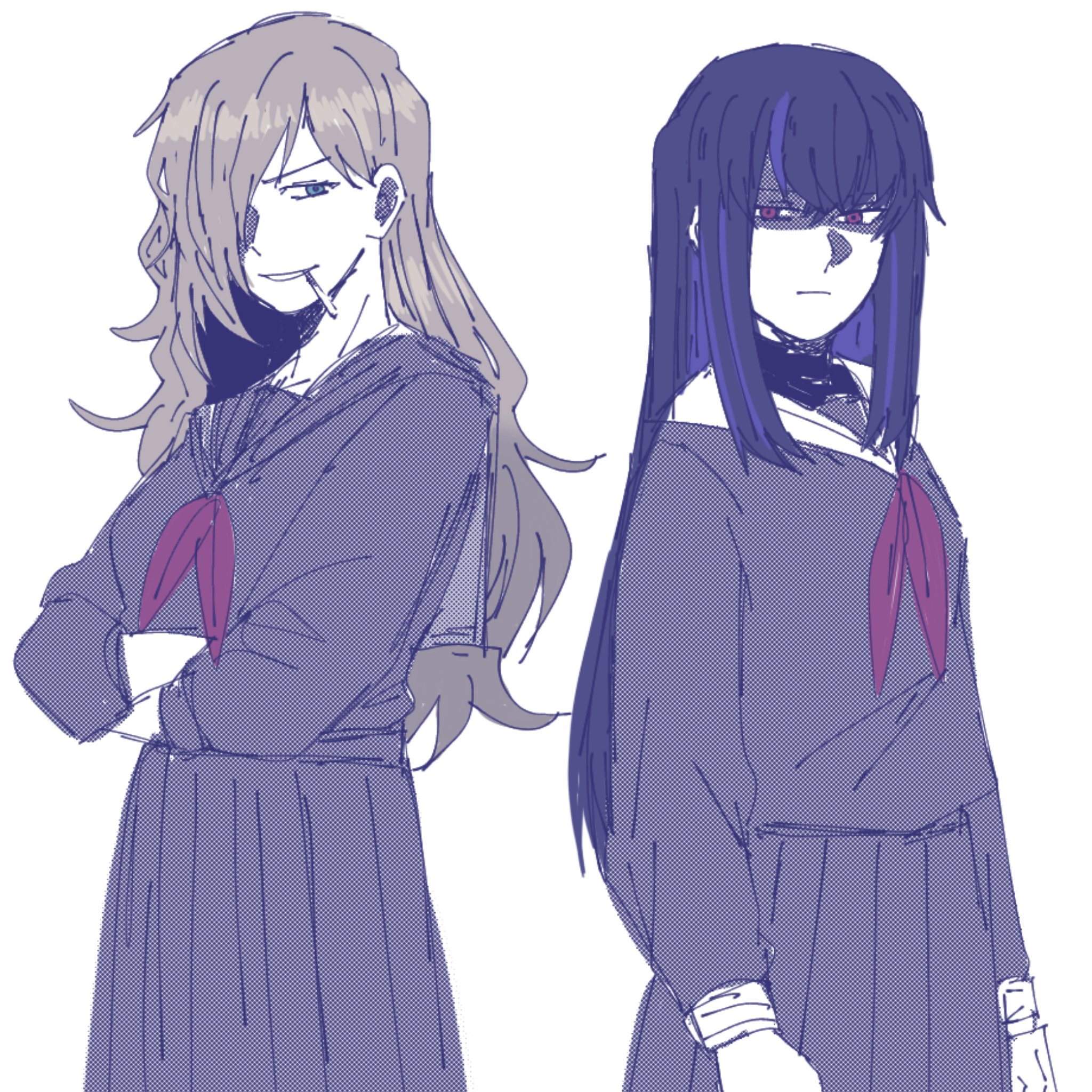 2girls aged_down angry back-to-back black_hair blue_eyes blue_sailor_collar blue_shirt blue_skirt blue_streaks brown_hair cigarette commentary crossed_arms hair_over_one_eye highres kiyosato_yuri limbus_company long_hair long_sleeves looking_at_viewer multicolored_hair multiple_girls neckerchief pleated_skirt project_moon red_eyes red_neckerchief sailor_collar school_uniform serafuku shaded_face shiomi_yoru_(project_moon) shirt simple_background skirt smirk smoking smug streaked_hair untranslatable_commentary valencina_(project_moon) white_background white_sailor_collar