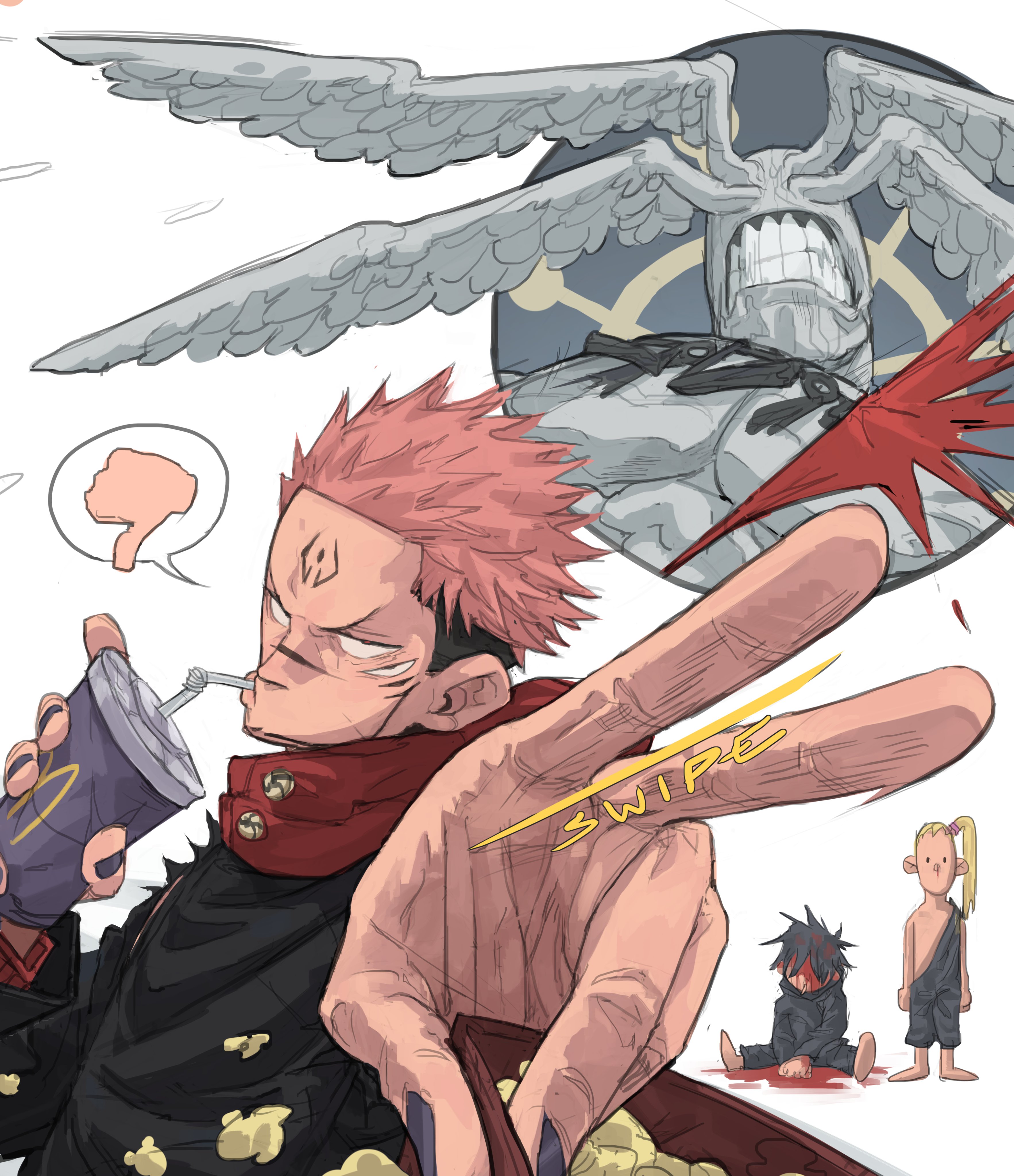4boys absurdres black_hair black_jacket blonde_hair bruniosktch cup disposable_cup extra_eyes feathered_wings fushiguro_megumi head_wings highres itadori_yuji jacket jujutsu_kaisen long_hair looking_at_viewer mahoraga_(jujutsu_kaisen) multiple_boys pink_hair ryoumen_sukuna_(jujutsu_kaisen) shigemo_haruta short_hair speech_bubble teeth wings