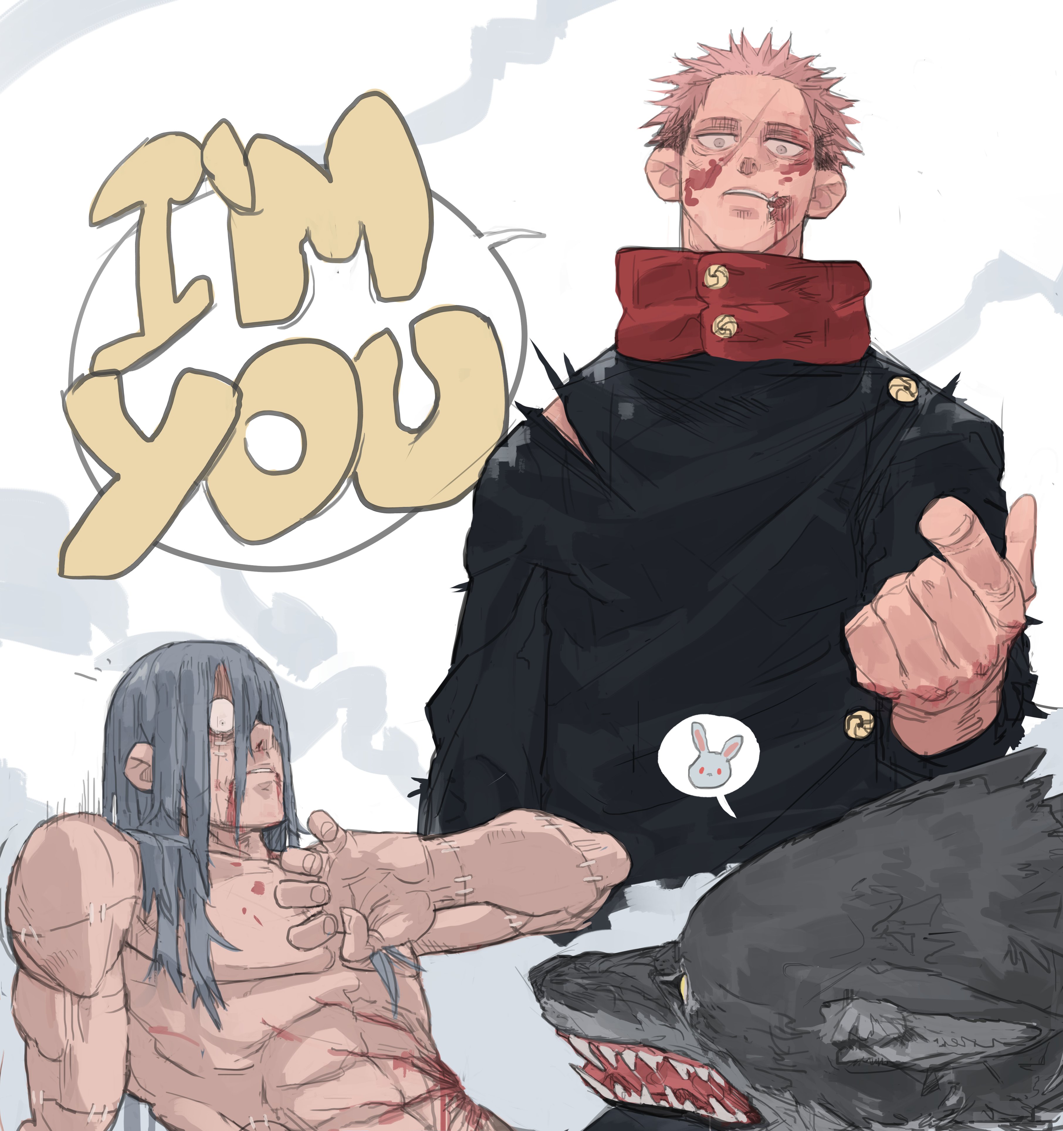 2boys absurdres black_jacket bruniosktch english_text grey_hair highres itadori_yuji jacket jujutsu_kaisen long_hair multiple_boys pink_hair short_hair speech_bubble topless_male white_background wolf