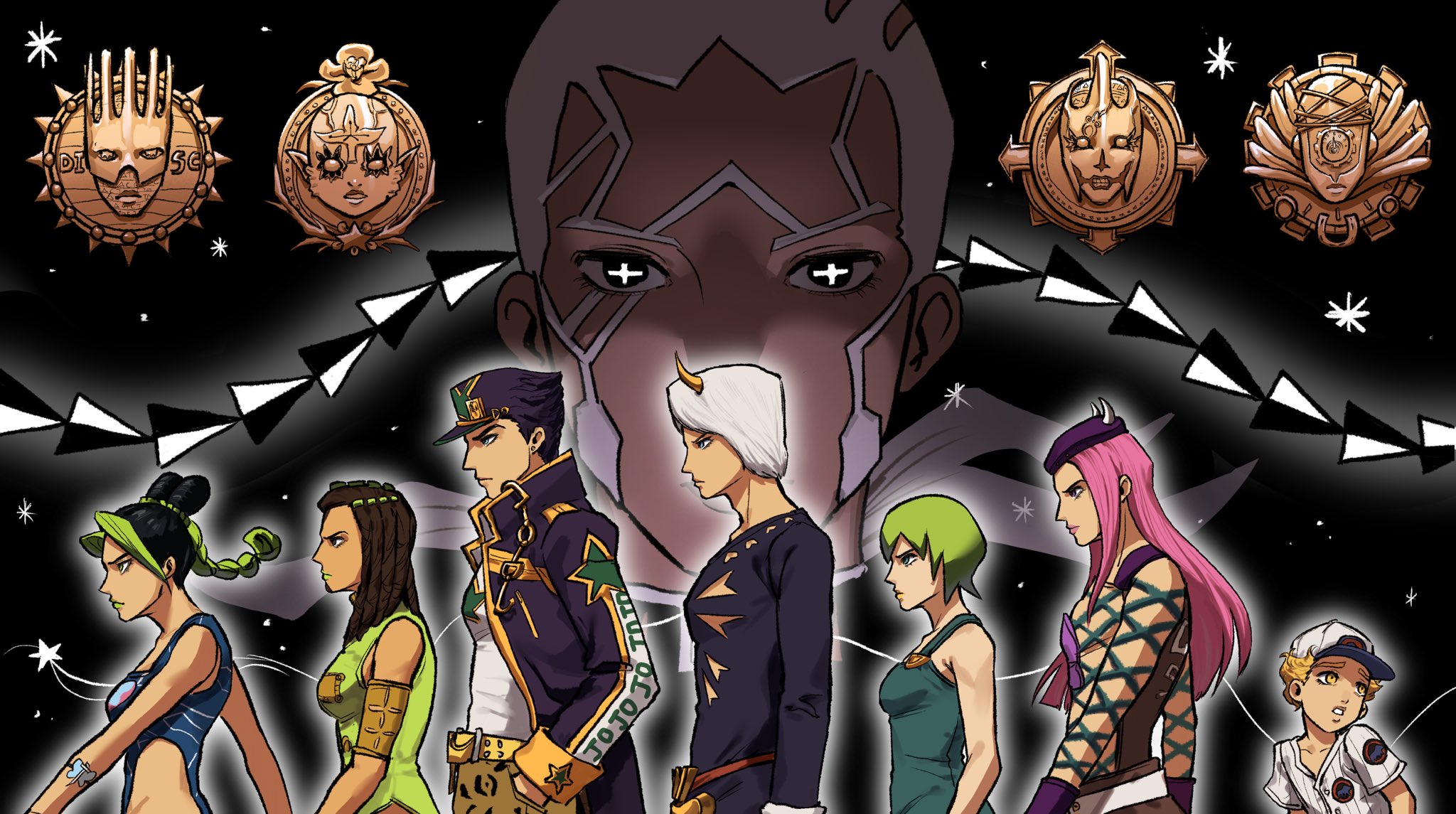 3girls 3others 6+boys armband baseball_cap baseball_uniform belt black_hair blonde_hair blue_bodysuit blue_tank_top bodysuit braid braided_ponytail brown_armband brown_hair brown_pants c-moon_(stand) cassock chain chudol3810 coat cross-shaped_pupils dark-skinned_male dark_skin double_bun dreadlocks emporio_alnino enrico_pucci enrico_pucci_(new_moon) ermes_costello fake_horns fishnet_top fishnets foo_fighters_(jojo) fur_hat green_baby_(jojo) green_hair green_overalls hair_bun hat highres horned_hat horns jojo_no_kimyou_na_bouken kuujou_jolyne kuujou_joutarou long_hair long_sleeves low_ponytail made_in_heaven_(stand) multicolored_hair multiple_boys multiple_girls multiple_others narciso_anasui open_clothes open_coat overalls pants pink_hair ponytail priest purple_coat purple_hat red_belt shirt short_hair sportswear stand_(jojo) star_(symbol) star_print stone_ocean symbol-shaped_pupils tank_top two-tone_hair weather_report white_hair white_hat white_shirt whitesnake_(stand) yellow_eyes