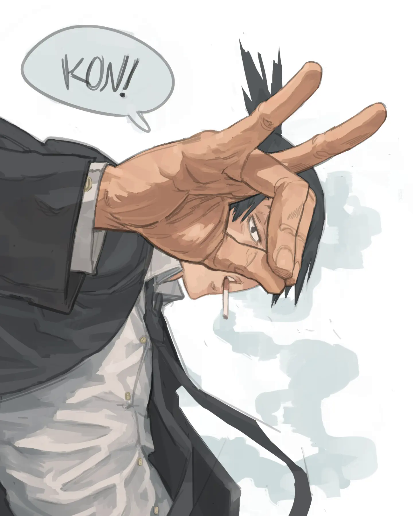 1boy black_hair black_jacket black_necktie bruniosktch chainsaw_man cigarette collared_shirt hayakawa_aki highres jacket looking_at_viewer male_focus necktie open_clothes open_jacket shirt short_hair simple_background smoking speech_bubble upper_body white_background white_shirt