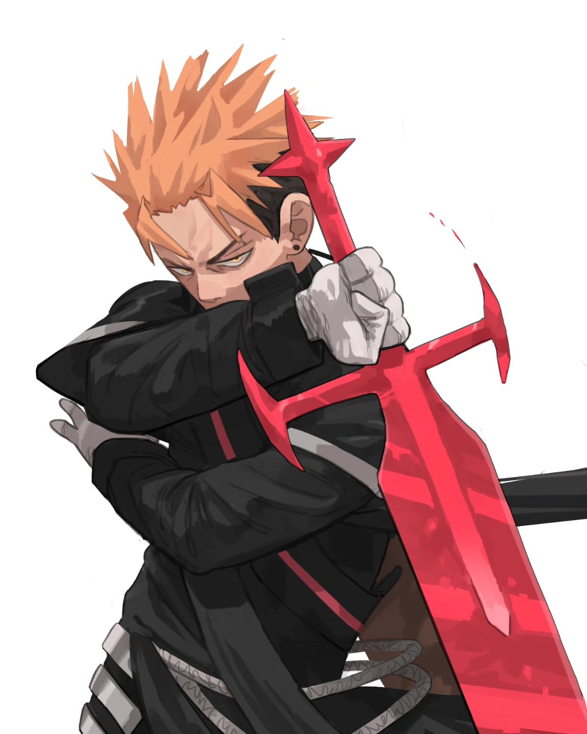 1boy black_coat bruniosktch coat gloves highres holding holding_sword holding_weapon looking_at_viewer male_focus orange_hair original short_hair simple_background sword upper_body weapon white_background white_gloves