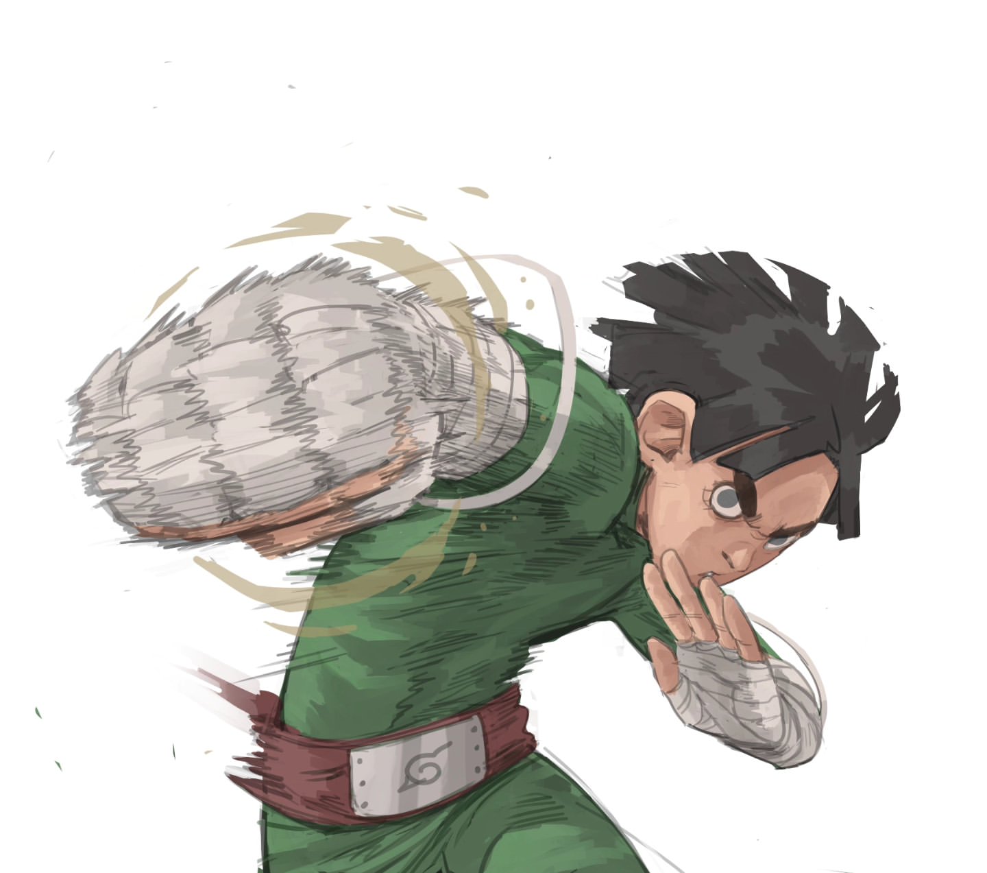 1boy bandaged_hand bandages black_hair bodysuit bruniosktch green_bodysuit highres konohagakure_symbol looking_at_viewer male_focus motion_blur naruto_(series) punching rock_lee short_hair simple_background white_background