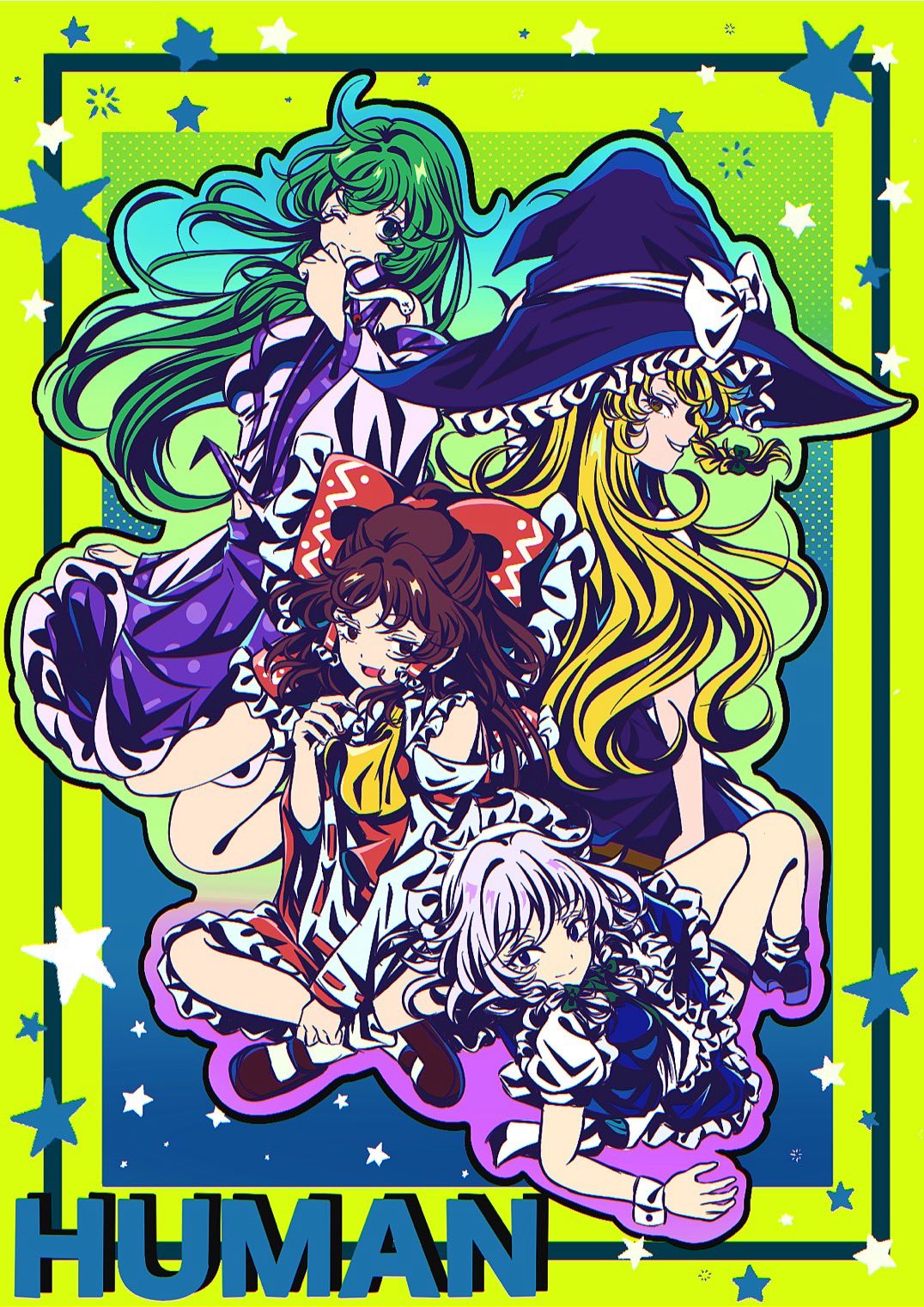 4girls black_hat blonde_hair blue_dress bow braid brown_hair detached_sleeves dress english_text frilled_hat frills green_background green_hair grey_hair hakurei_reimu hat highres izayoi_sakuya kirisame_marisa kochiya_sanae maid_headdress multiple_girls nontraditional_miko open_mouth profile purple_skirt red_bow red_skirt sitting skirt touhou tsumutsumugi twin_braids wariza wide_sleeves witch_hat