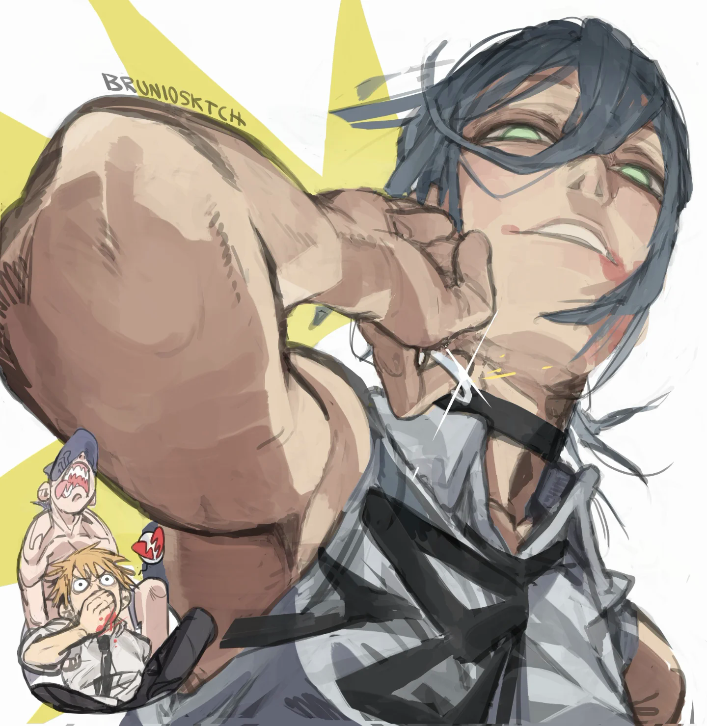 1girl 2boys artist_name black_choker black_hair blonde_hair bruniosktch chainsaw_man choker collared_shirt denji_(chainsaw_man) highres looking_at_viewer loosely_tucked_bangs multiple_boys reze_(chainsaw_man) shirt sleeveless sleeveless_shirt white_shirt