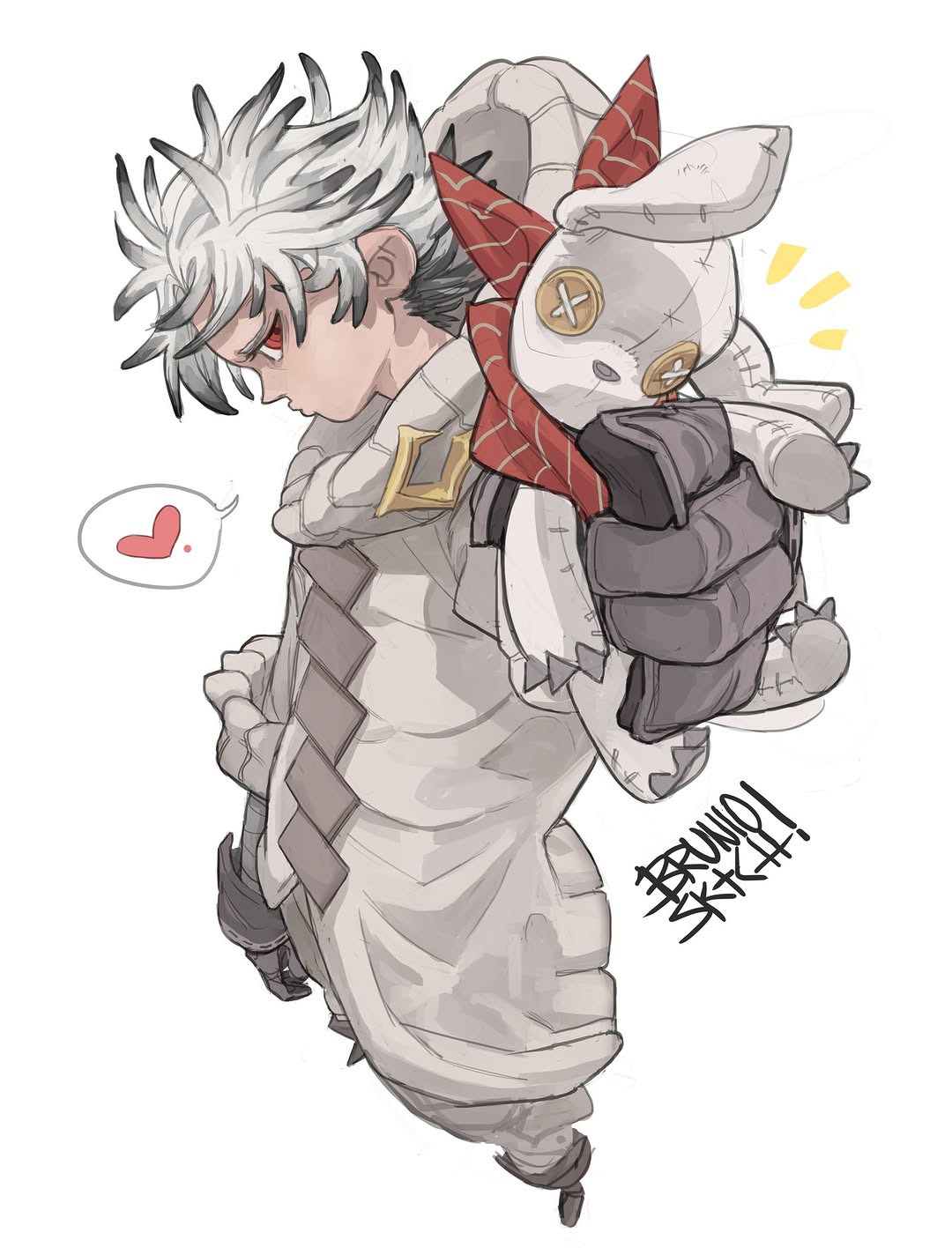 1boy artist_name bruniosktch coat full_body gachiakuta gloves grey_gloves heart highres holding holding_stuffed_toy looking_at_viewer male_focus red_eyes rudo_surebrec short_hair signature simple_background speech_bubble stuffed_animal stuffed_toy white_background white_coat white_hair