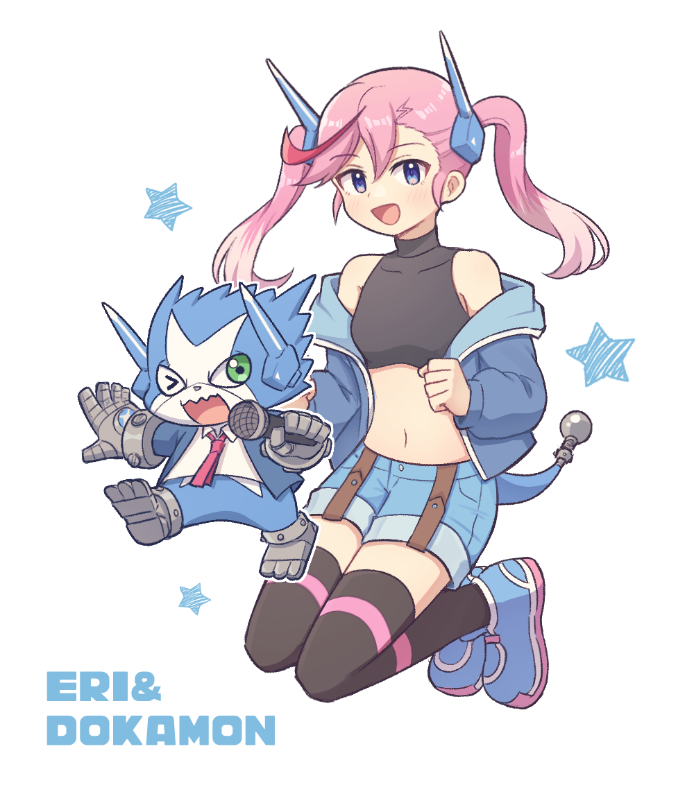 1girl appmon blue_shoes blue_skin character_name collared_shirt colored_skin cosplay crop_top denim denim_shorts digimon digimon_universe:_appli_monsters dokamon dokamon_(cosplay) green_eyes hair_ornament holding holding_microphone jacket karan_eri karan_eri_(cosplay) lulu_hane microphone multicolored_hair multicolored_skin navel necktie open_clothes open_jacket open_mouth pink_hair pink_necktie purple_hair shirt shoes shorts simple_background smile streaked_hair thighhighs twintails two-tone_skin white_background white_shirt white_skin