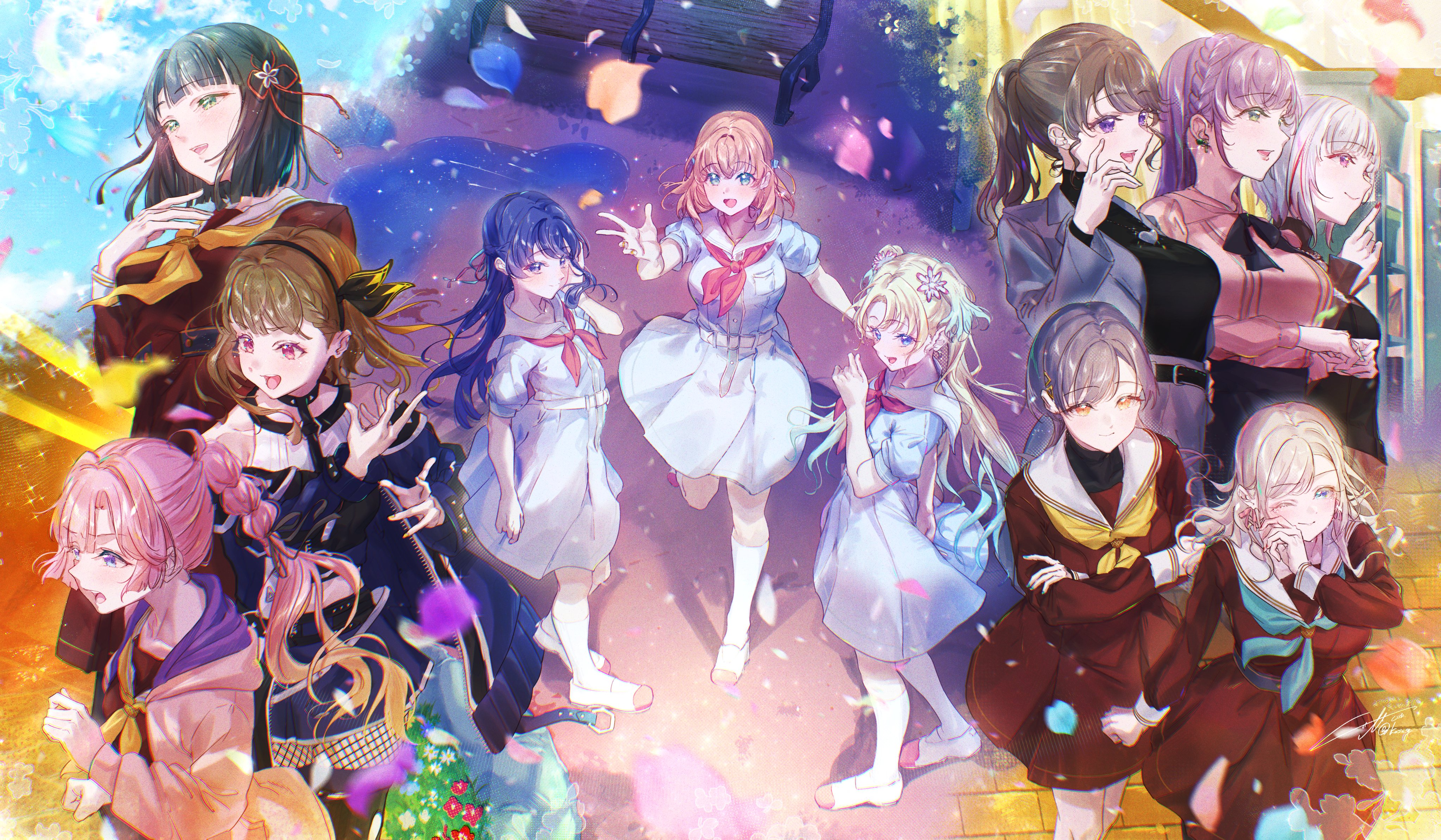 6+girls :d ;) absurdres ampere_(love_live!) anyoji_hime aqua_eyes black_hair black_hairband black_pantyhose black_ribbon black_sweater blonde_hair blue_coat blue_dress blue_eyes blue_hair blue_ribbon blue_skirt blunt_bangs blunt_ends bob_cut braid breast_pocket breasts brown_dress brown_hair center-flap_bangs ceras_yanagida_lilienfeld coat commentary_request crossed_arms crown_braid curtained_hair dress earrings edel_note fishnet_pantyhose fishnets flower flower_earrings flower_knot fujishima_megumi fujishima_megumi_(post-graduation) full_body gradient_hair green_eyes grey_jacket hair_flower hair_ornament hair_ribbon hairband half_updo hasu_no_daisankaku hasu_no_sanrenka hasu_no_shousankaku hasu_no_sora_school_uniform highres hinoshita_kaho hood hooded_jacket jacket jellyfish_cut jewelry kachimachi_kosuzu katsuragi_izumi kuzia_(atarayo) large_breasts leg_up link!_like!_love_live! long_hair long_sleeves looking_at_viewer love_live! medium_dress medium_hair miniskirt momose_ginko multi-tied_hair multicolored_hair multiple_girls murano_sayaka neck_ribbon neckerchief off-shoulder_coat off_shoulder one_eye_closed open_clothes open_coat open_jacket open_mouth orange_eyes orange_hair osawa_rurino otomune_kozue otomune_kozue_(post-graduation) pantyhose parted_bangs pink_eyes pink_flower pink_hair pink_jacket pink_ribbon pink_shirt pleated_dress pleated_skirt pocket ponytail purple_eyes purple_hair rabbit_hair_ornament red_neckerchief red_ribbon red_shoes red_streaks ribbon sailor_collar sailor_dress school_uniform shirt shoes short_hair short_sleeves side_braids sidelocks skirt smile standing streaked_hair suit_jacket summer_uniform sweater swimsuit triangle_hair_ornament turtleneck turtleneck_sweater twintails two_side_up uwabaki virtual_youtuber white_flower white_hair white_sailor_collar winter_uniform yellow_neckerchief yugiri_tsuzuri yugiri_tsuzuri_(post-graduation)