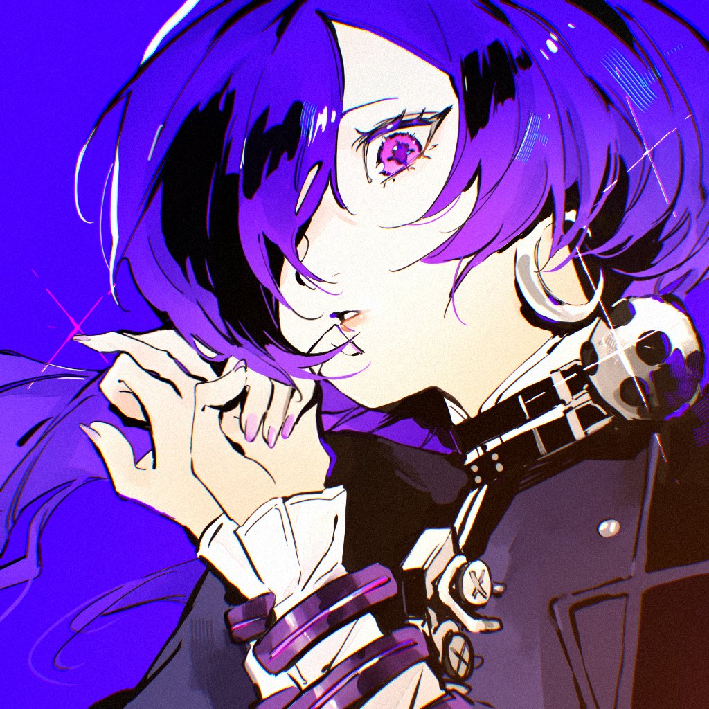 1girl black_cloak blue_background bound bound_wrists cloak commentary_request crescent crescent_earrings earrings hair_over_one_eye hands_up jewelry long_hair mina_(mina_st4r) parted_lips portrait promeia_(zenless_zone_zero) purple_eyes purple_hair purple_nails solo sparkle zenless_zone_zero