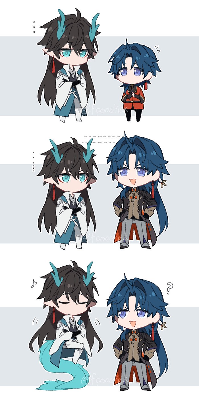 2boys ahoge alternate_costume aqua_eyes black_hair blade_(honkai:_star_rail) blue_hair chibi chinese_clothes commentary_request crossed_arms dan_feng_(honkai:_star_rail) dan_heng_(honkai:_star_rail) dan_heng_(imbibitor_lunae)_(honkai:_star_rail) double-parted_bangs dragon_horns dragon_tail earrings fpoastick gloves hair_between_eyes hair_ornament hairpin hands_on_own_hips highres honkai:_star_rail honkai_(series) horns jacket jewelry long_hair male_focus multiple_boys official_alternate_eye_color pointy_ears purple_eyes shoes single_earring tail two-tone_background very_long_hair wide_sleeves yingxing_(honkai:_star_rail)