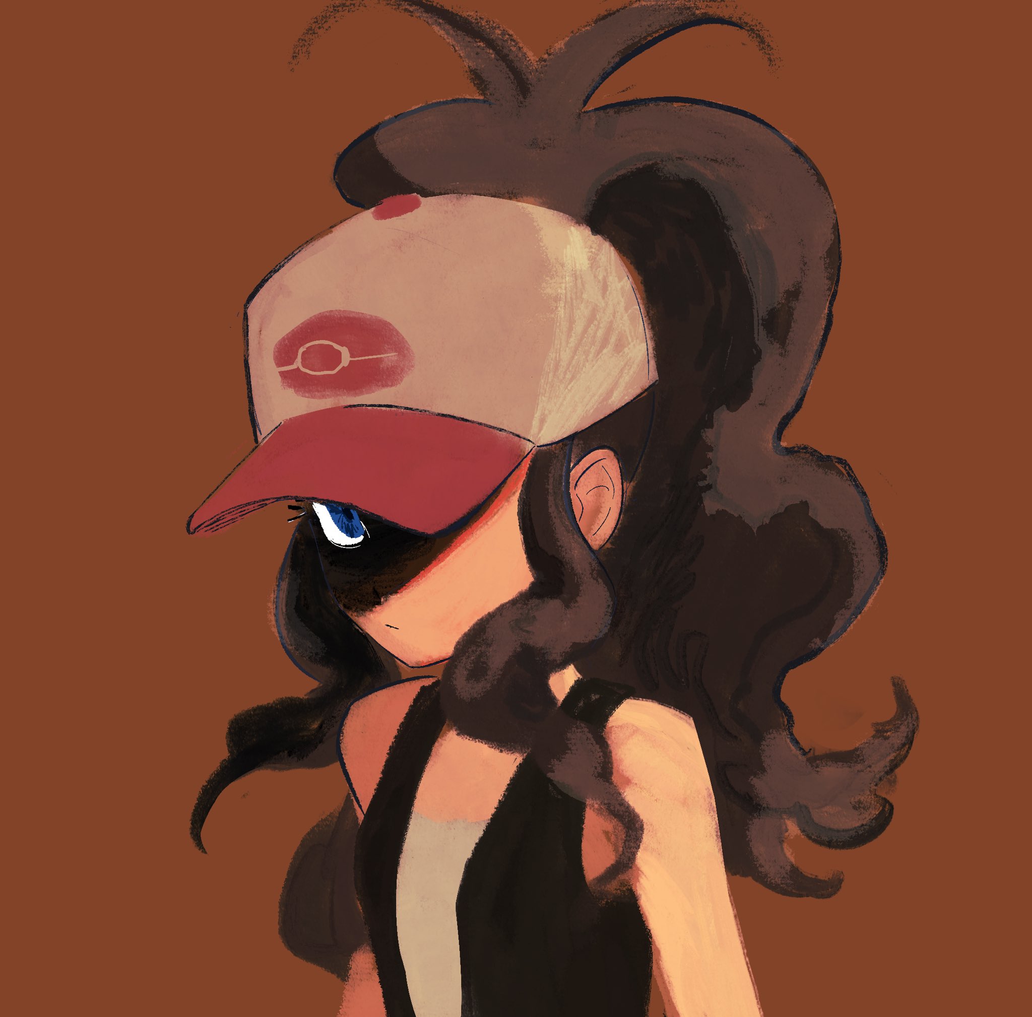 1girl baseball_cap black_vest blue_eyes brown_background brown_hair expressionless hat high_ponytail highres hilda_(pokemon) looking_at_viewer nintendo partially_shaded_face pokemon pokemon_black_and_white ponytail sidelocks solo suagrsquare tank_top upper_body vest white_hat white_tank_top