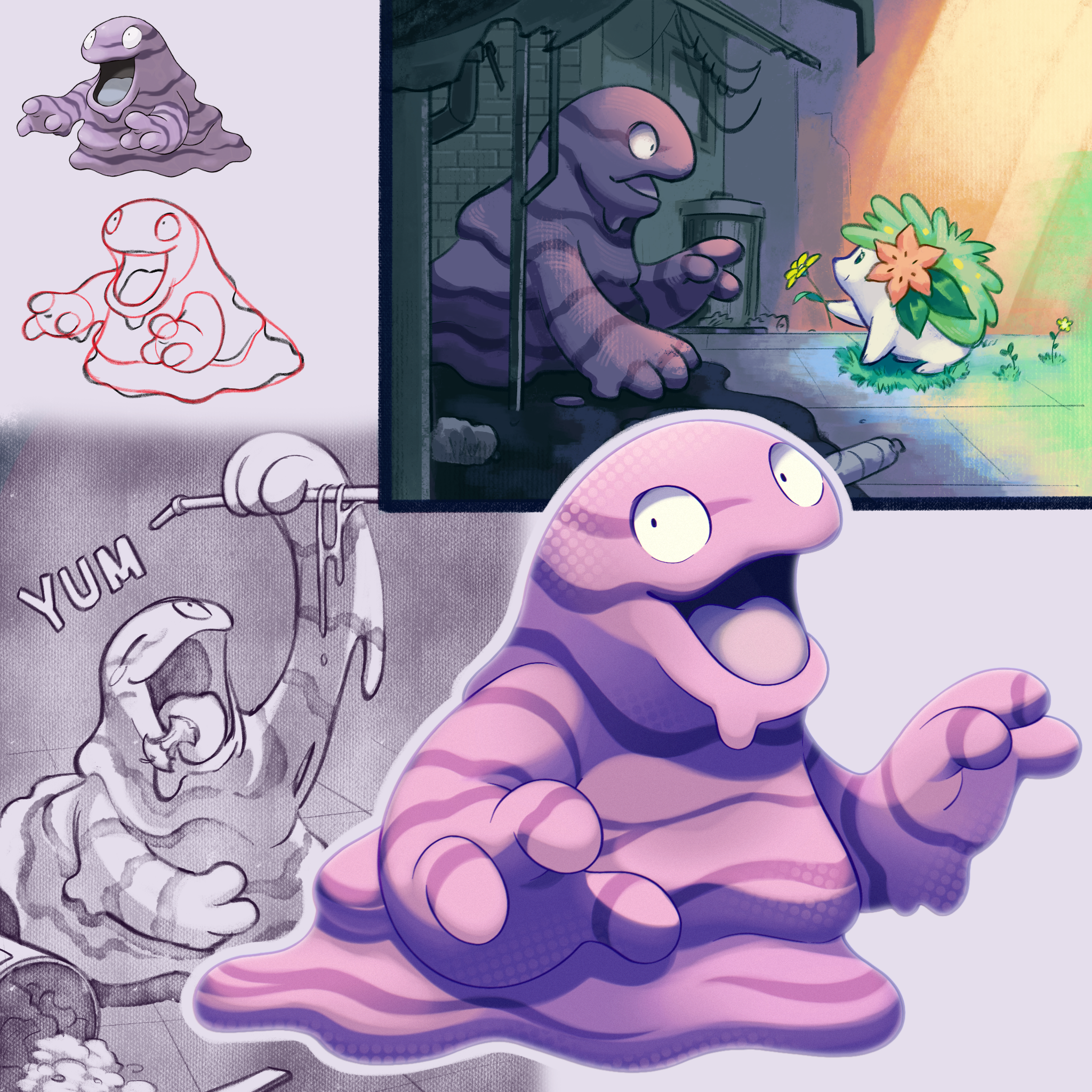 apple eating flower food fruit gen_1_pokemon gen_4_pokemon grass green_fur grimer hedgehog highres legendary_pokemon mythical_pokemon nintendo no_humans one_eye_closed open_mouth pink_flower pokemon pokemon_(creature) pokemon_focus pokemon_firered_and_leafgreen shaymin shoupitsuki trash_can