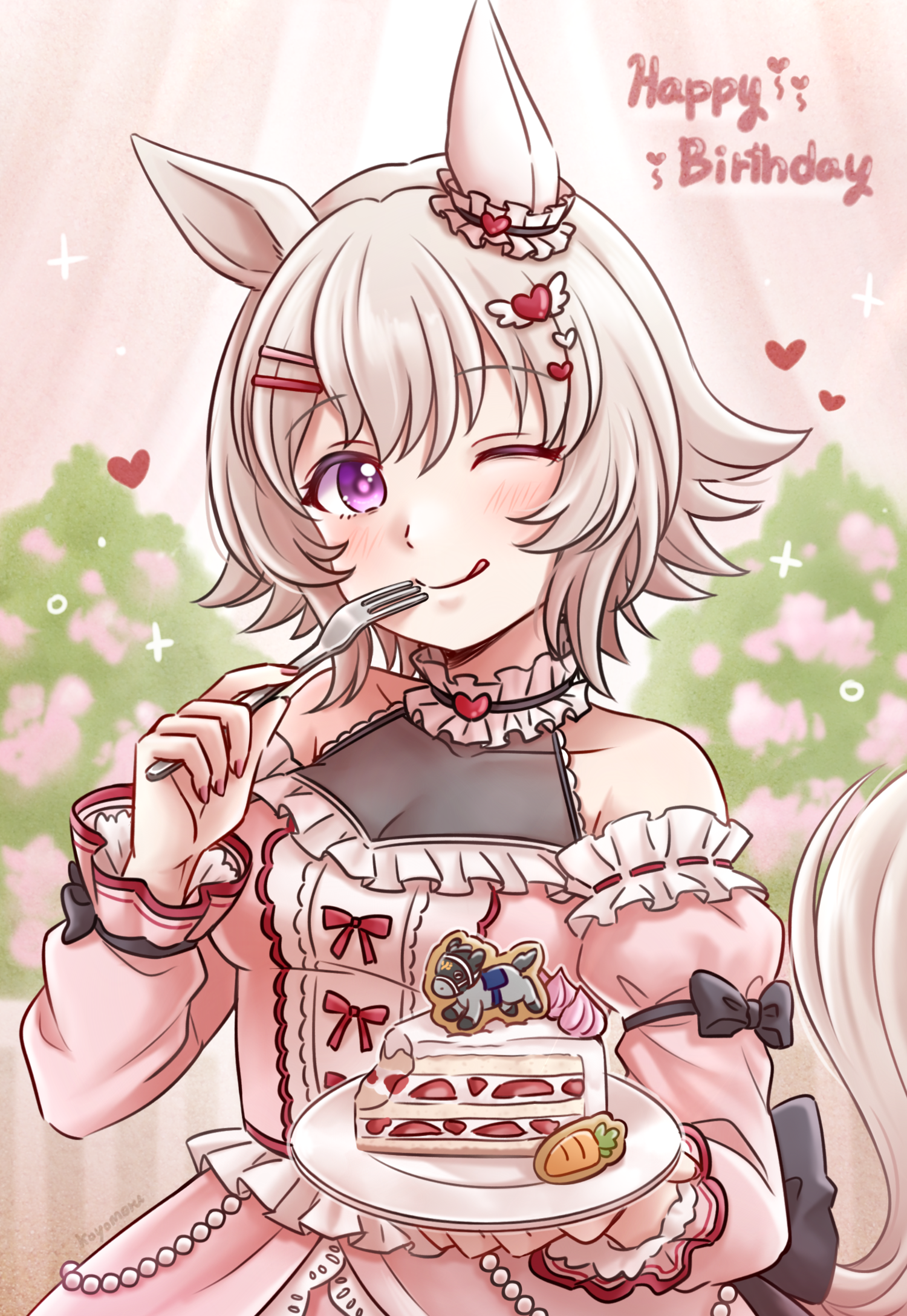 1girl animal_ears bare_shoulders blush bow breasts cake cake_slice cleavage closed_mouth collar commentary_request curren_chan_(racehorse) curren_chan_(umamusume) detached_sleeves dress ear_covers food fork frilled_collar frills grey_hair hair_between_eyes hair_ornament happy_birthday heart heart_hair_ornament highres holding holding_fork horse_ears horse_girl horse_tail koyomeru looking_at_viewer medium_breasts one_eye_closed pink_dress pink_sleeves purple_eyes red_bow see-through_clothes see-through_sleeves short_hair single_ear_cover smile tail tongue tongue_out umamusume