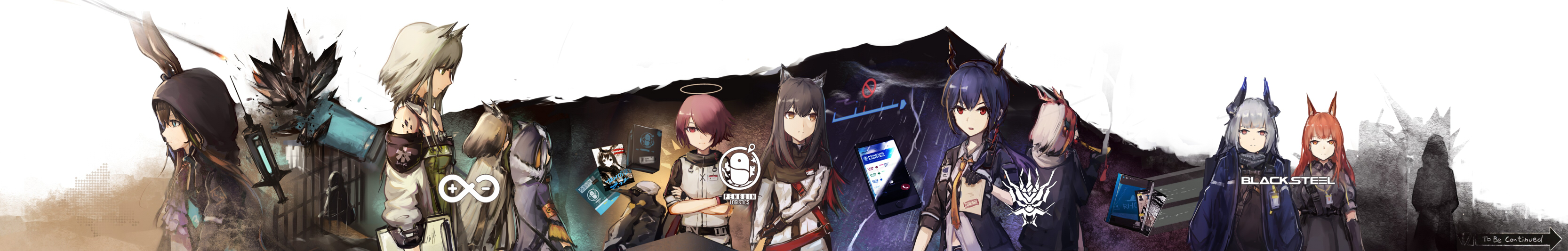 1boy 1other 6+girls absurdres ambiguous_gender amiya_(arknights) animal_ears arknights bird black_hair blacksteel_worldwide_logo blonde_hair blue_eyes blue_hair brown_hair ch'en_(arknights) chen_feng_si crossed_arms doctor_(arknights) dragon_horns drone emperor_(arknights) exusiai_(arknights) fox_ears franka_(arknights) grey_hair halo highres holding hood hood_up hooded_jacket horns jacket kal'tsit_(arknights) liskarm_(arknights) long_hair long_image looking_at_viewer mask multiple_girls originium_(arknights) penguin penguin_logistics_logo pink_hair pointy_ears ptilopsis_(arknights) rabbit_ears red_eyes red_hair rhine_lab_logo shield shirt short_hair silence_(arknights) texas_(arknights) to_be_continued weapon wei_yenwu_(arknights) white_hair wide_image yan_logo