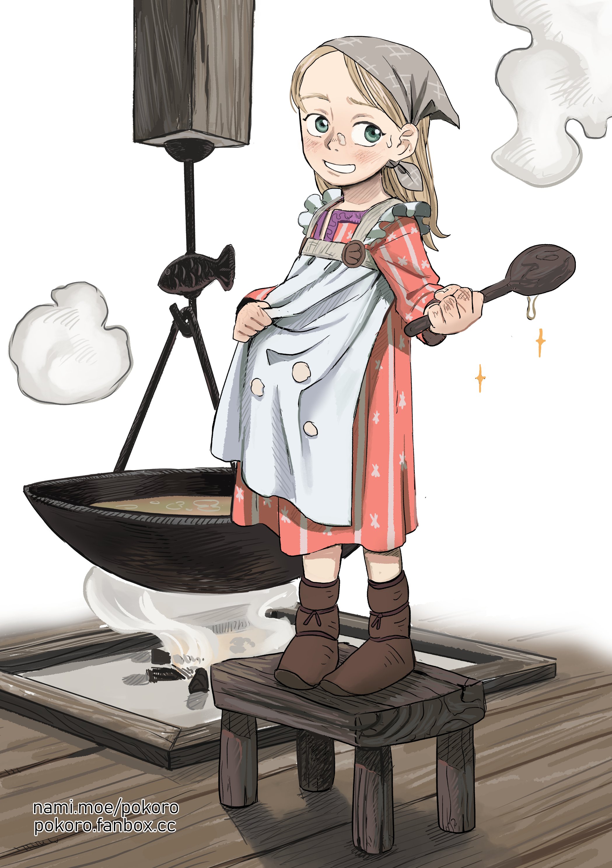 1girl absurdres ann_(pokoro) apron artist_name blonde_hair blue_eyes blush child cooking cooking_pot dirty dress dripping full_body grin highres holding long_hair original pink_dress pokoro simple_background smile solo sparkle spoon standing steam stool watermark web_address white_apron wooden_floor