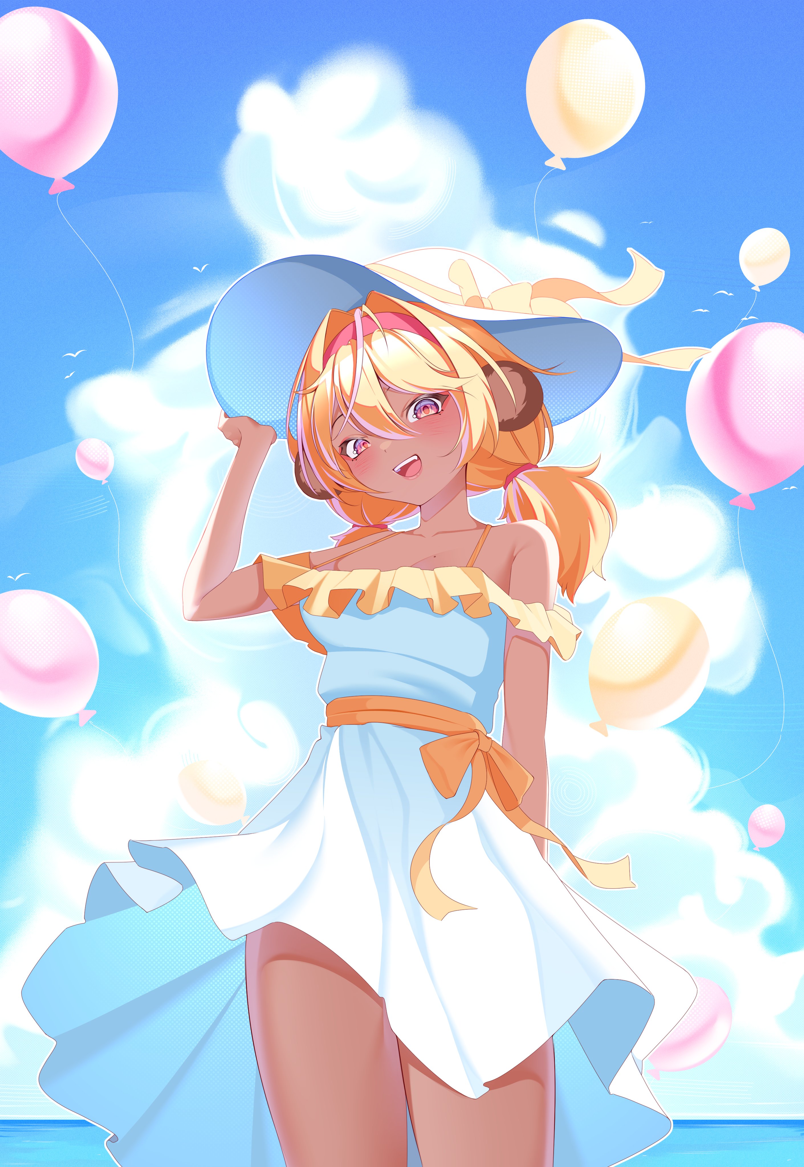 1girl absurdres animal_ears balloon bare_shoulders blonde_hair blue_sky breasts cleavage cloud dark-skinned_female dark_skin dress hairband hat highres indie_virtual_youtuber koko_d._nuts looking_at_viewer mats_kuro mole mole_on_breast monkey_ears monkey_girl open_mouth pink_eyes pink_hair sky smile standing sundress thighs twintails virtual_youtuber water white_dress white_hat
